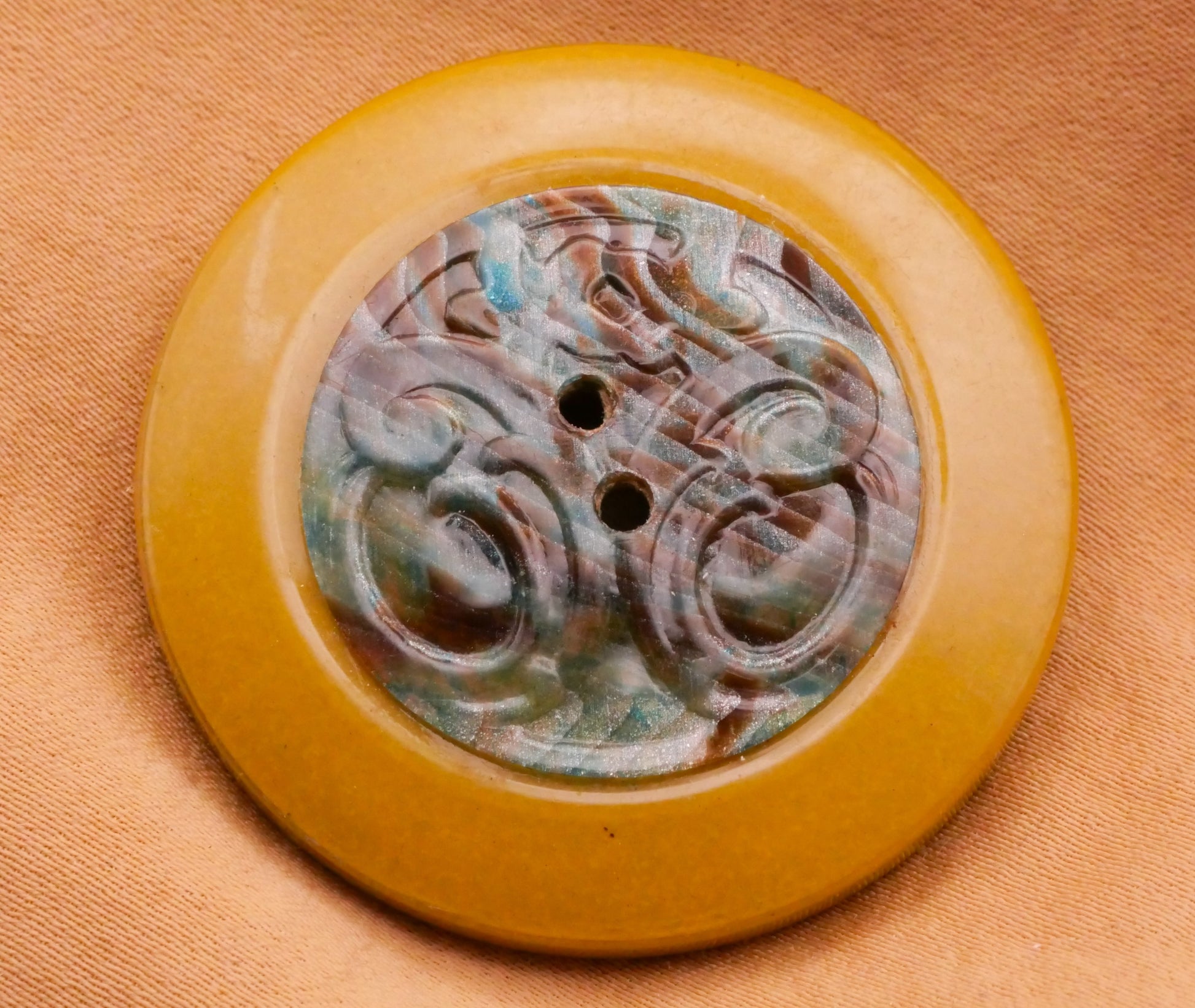Wow, unique celluloid early plastic tight top with center medallion with filigree design. Love the blue and brown marbling. Large size measuring 38mm / 1.5" in diameter.