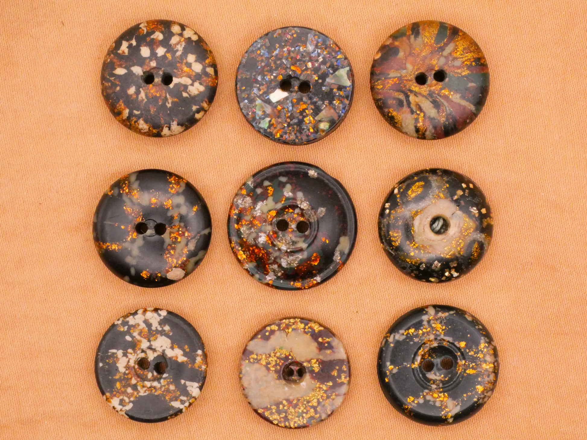 Very cool speckled composition early plastic buttons with gold glitter! Love! These measure between 17-19mm / .67"-.75". Choose top, middle, or bottom and left, center, or right.