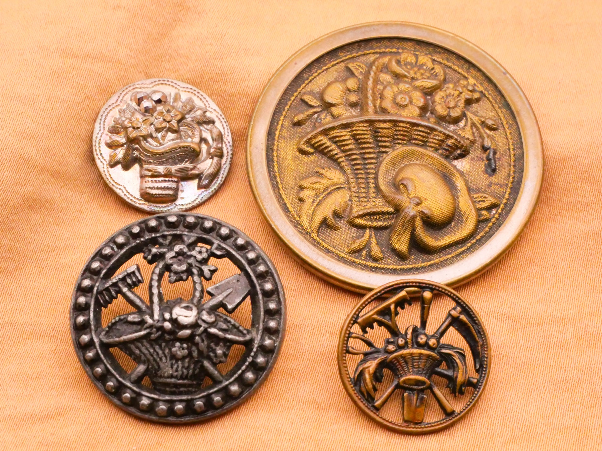 Beautiful flower basket motif Victorian buttons, choose your favorite! Top left even has steel-cuts! These measure between 18-39mm / .71"-1.54". Choose top or bottom and left or right.