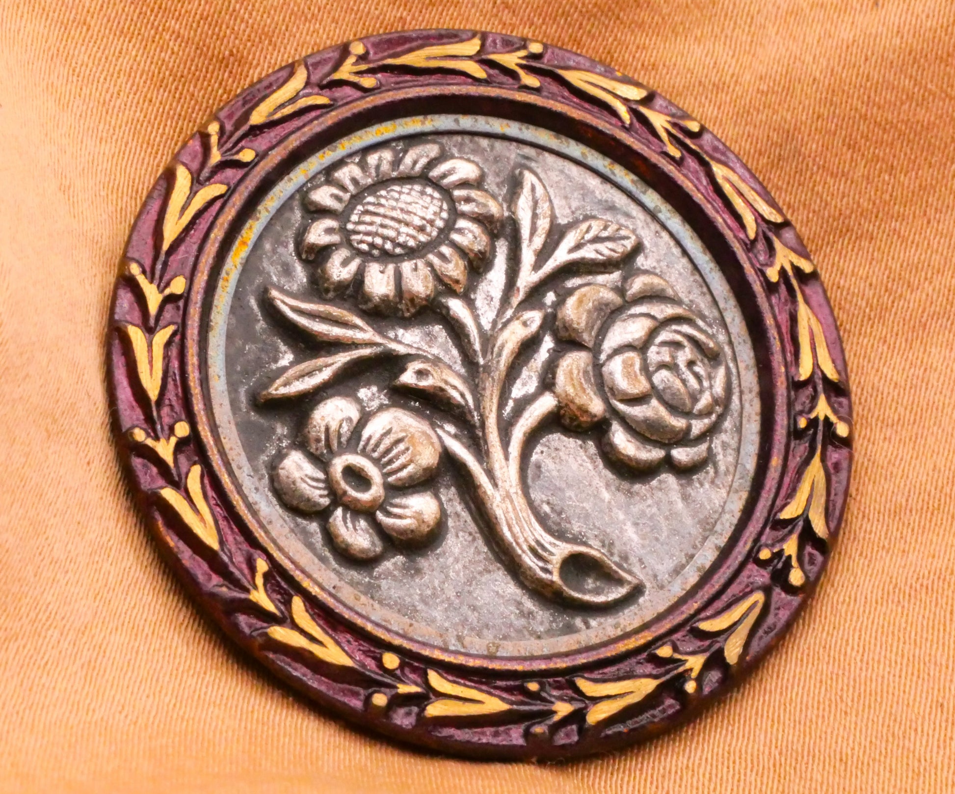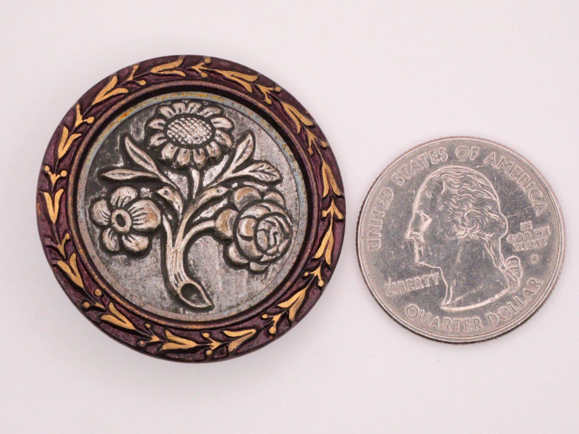Wow! Amazing flower floral bouquet in silver metal with gold and purple tinted frame! Large button measures 36mm / 1.42" in diameter.