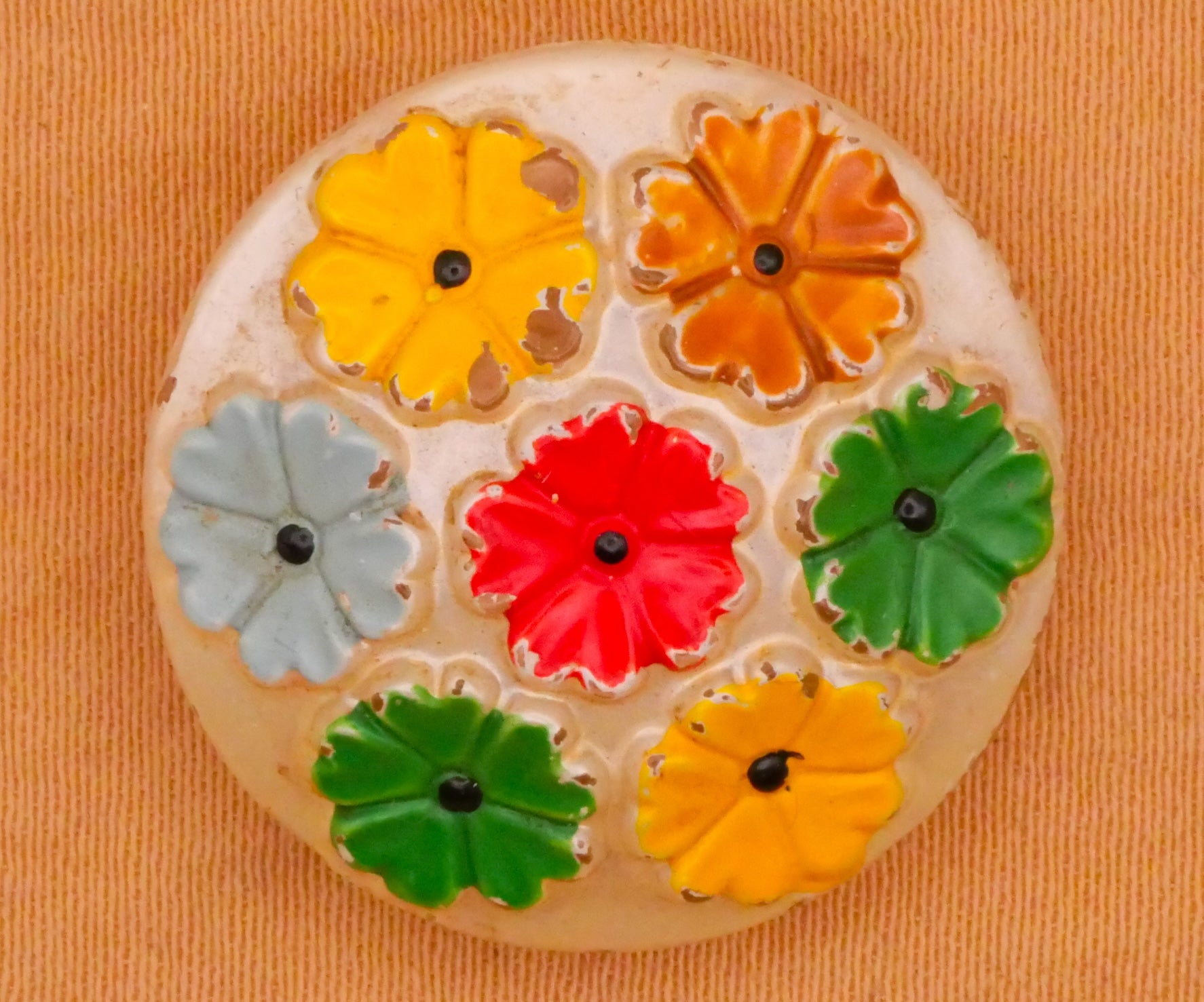 Fun and colorful vintage flower glass button with color flowers and pearlized background. Measures 23mm / .91" in diameter.