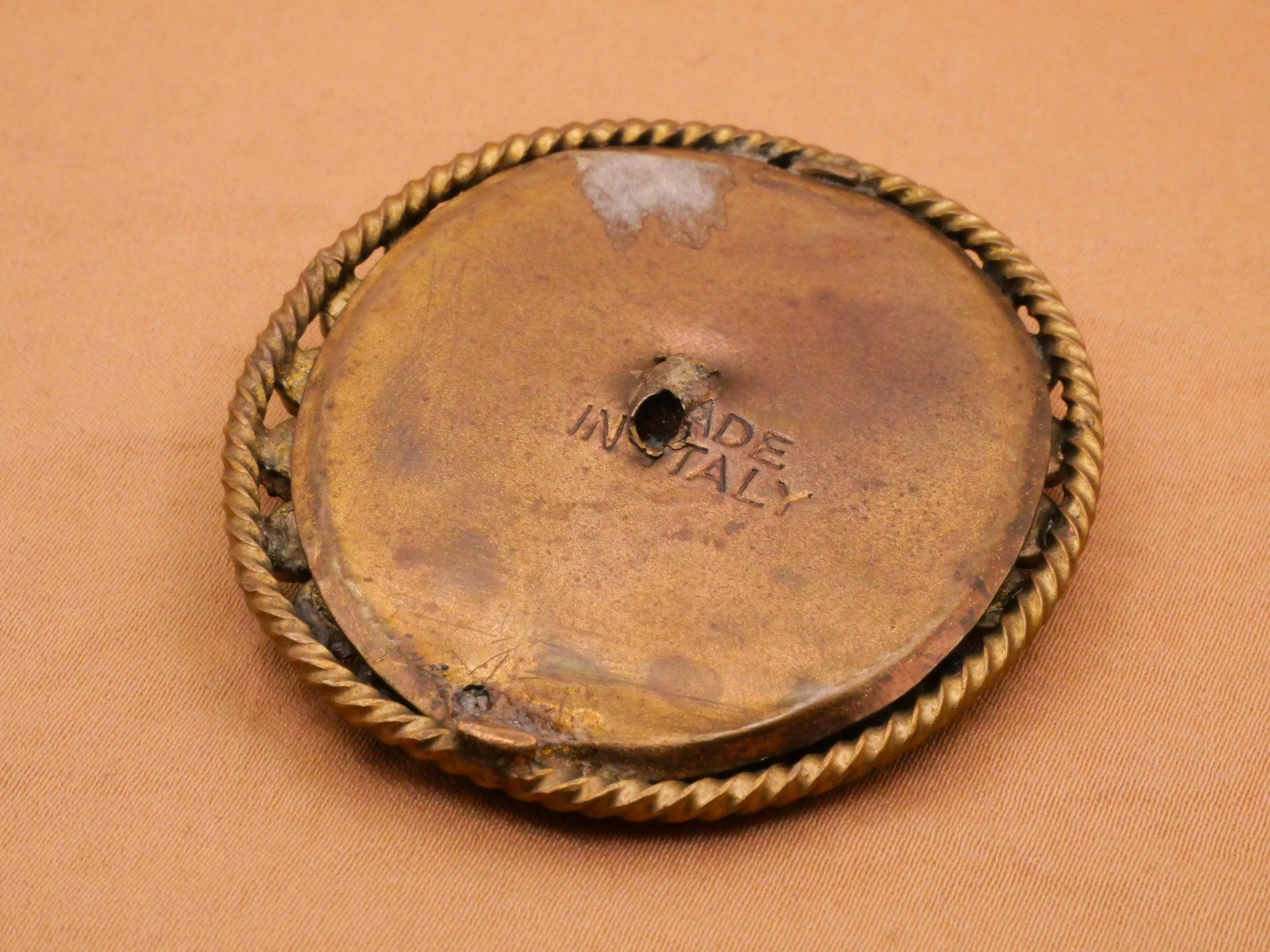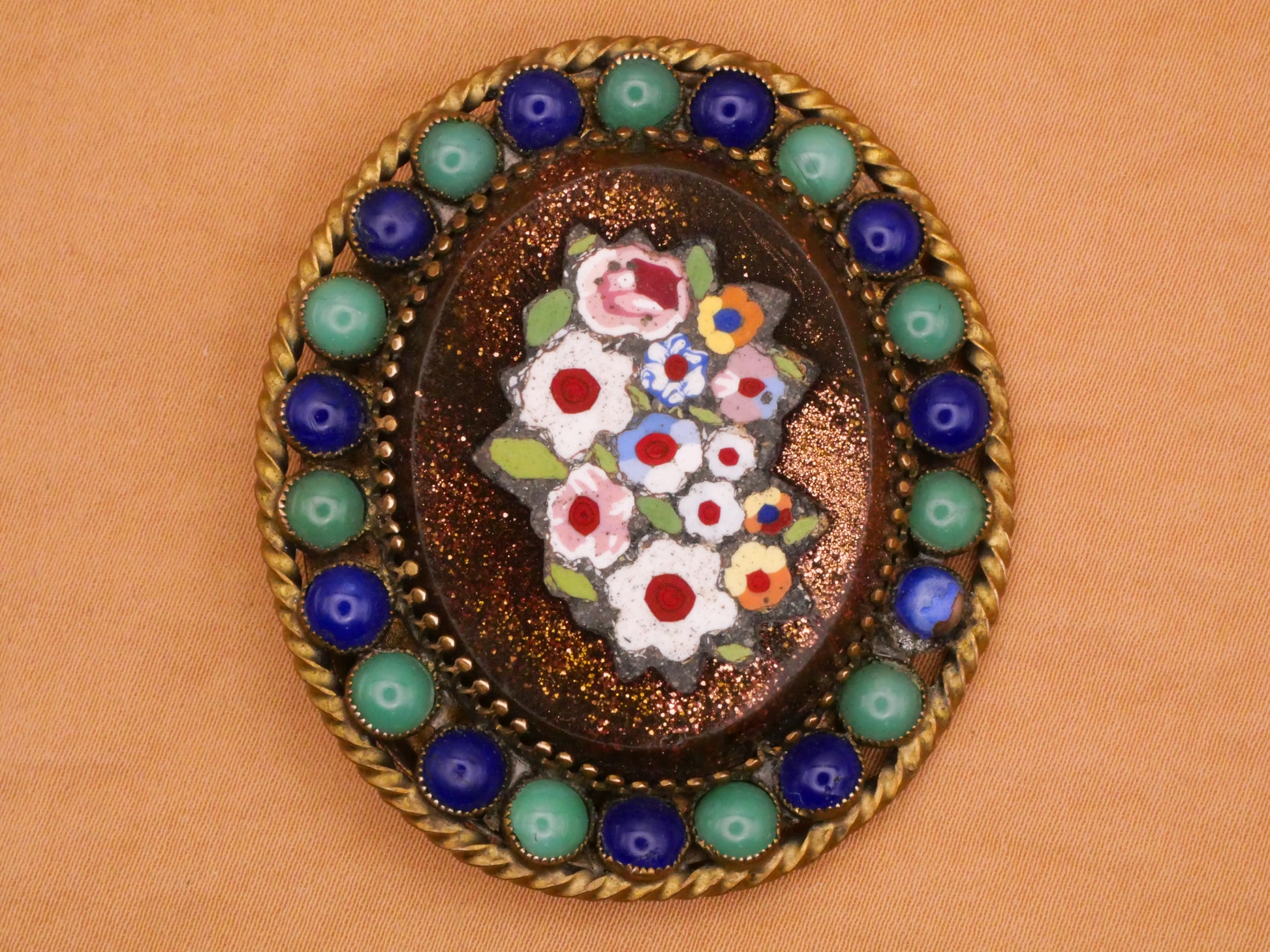 Amazing large Italian mosaic button! This bronze metal button has blue and turquoise colored gems framing the outside and a gold glitter and mosaic flower medallion in the center. So pretty and unusual! One prong from the setting is missing and one of the blue gems appears to have been repaired. This button measures an extra-large 45 x 51mm / 1.77" x 2".
