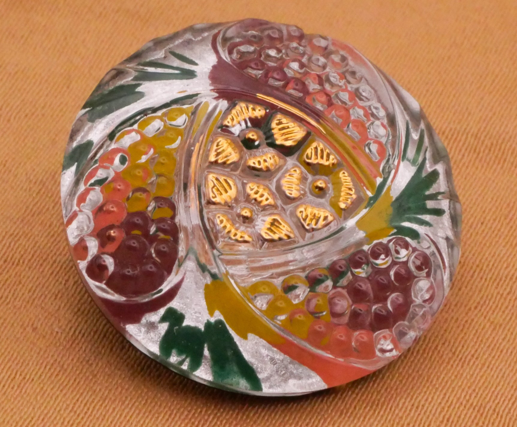 Beautiful reverse painted Czech glass button with flower and paisley design and gold accent paint on the front. Measures 22mm / .87" in diameter.