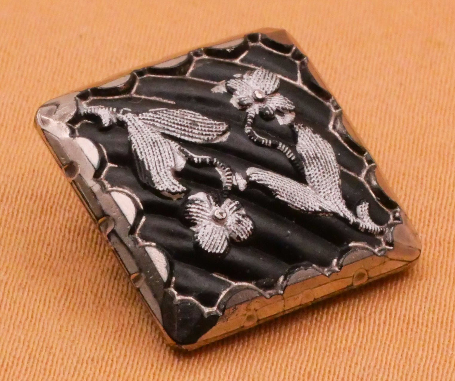 Wonderful antique black glass square shape button with two flowers and silver luster. Love the scallop look edge. Measures 17mm / .67" across.