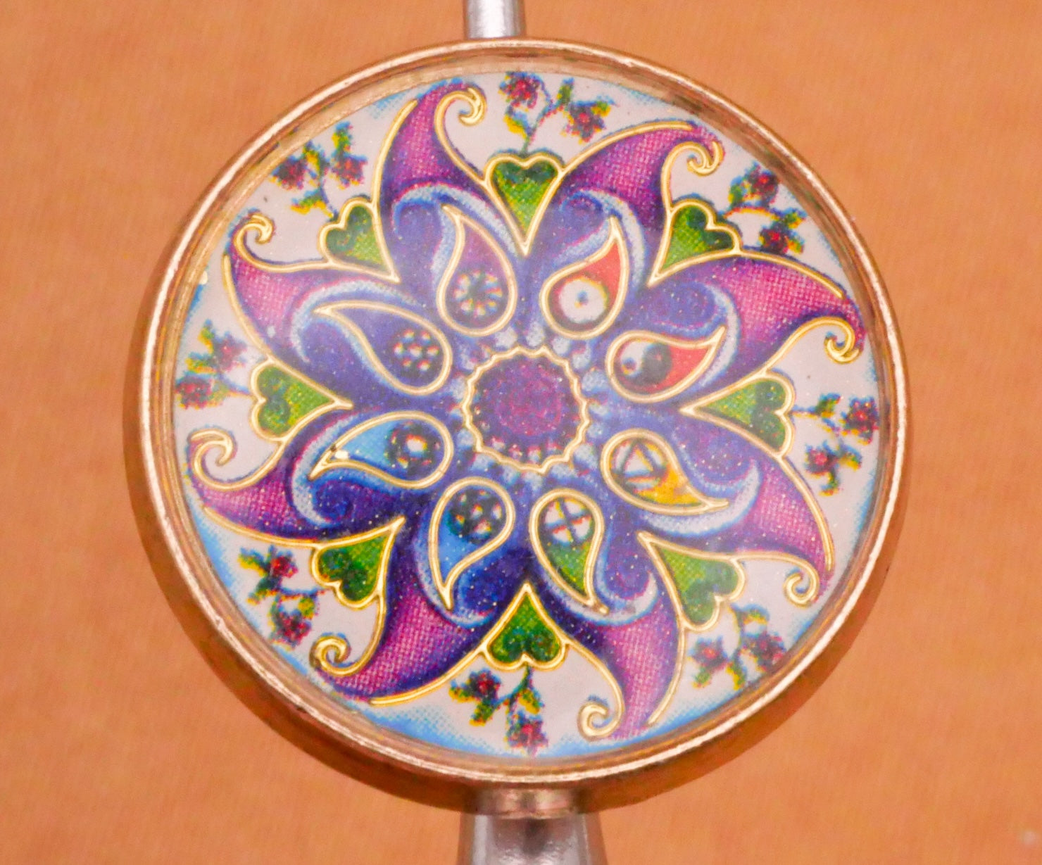 Love this button with paisleys, hearts, flower, yin-yang, and more in a swirl design, which is covered in resin and in a gold metal setting. Pretty purple, blue, and green colors! Measures 18mm / .71" in diameter.