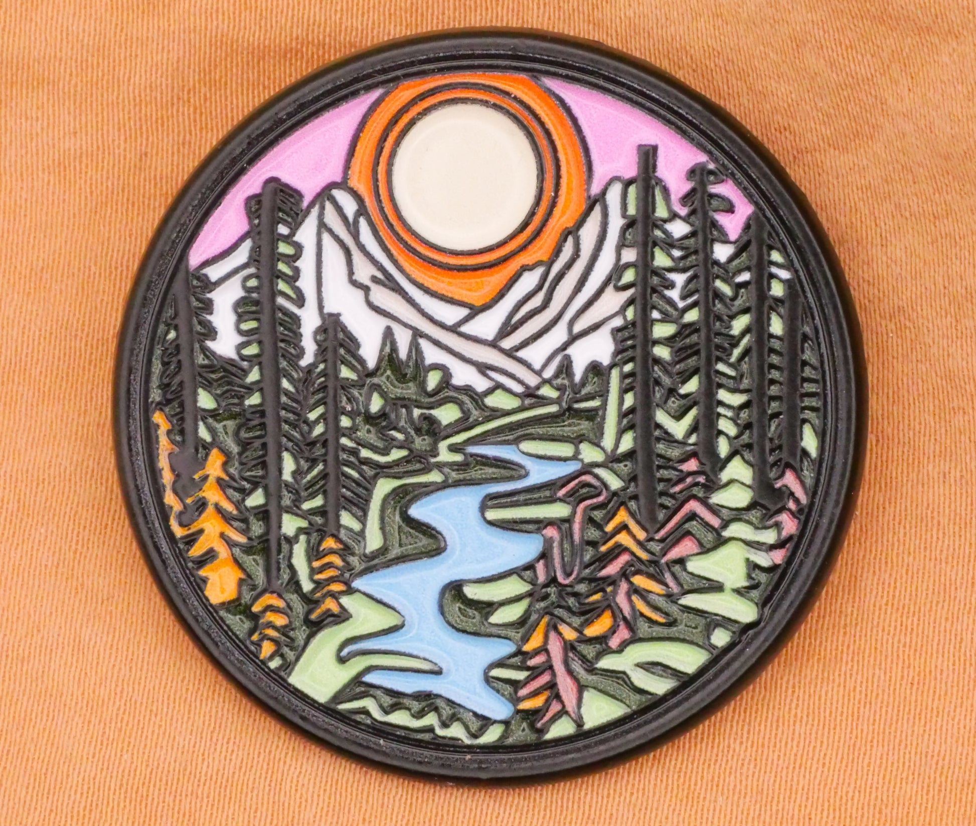 Amazing detailed landscape scene with sun, mountains, trees, and river. Enamel and metal button measures a large 36mm / 1.42" in diameter.