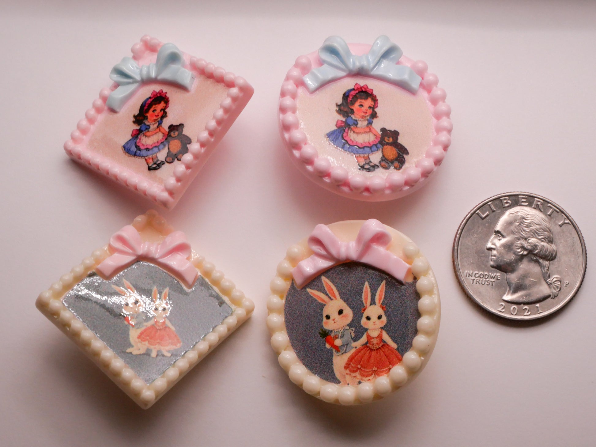Just darling kids buttons! Top row has girl with teddy bear and bottom row a boy and girl bunny. Love the bows too! These measure between 32-37mm / 1.26"-1.46". Choose top or bottom and left or right.