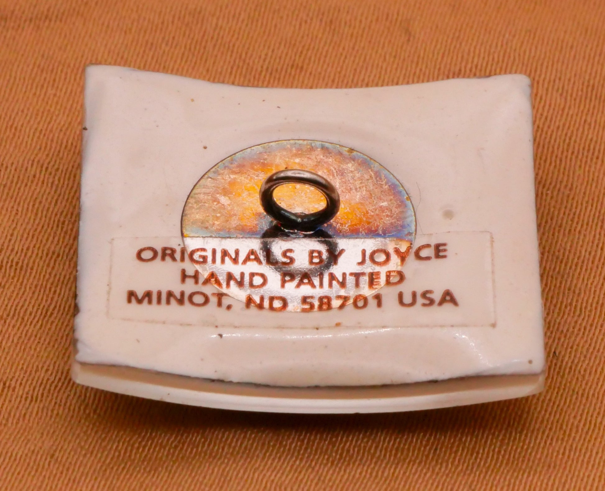 Wow! One of my favorite Joyce Hendrickson studio buttons to date! This beautiful hand-painted watch crystal glass button depicts a bountiful basket of fruit! Signed JH on front and includes an artist applied sticker on back. Measures 21 x 24mm / .83" x .95".