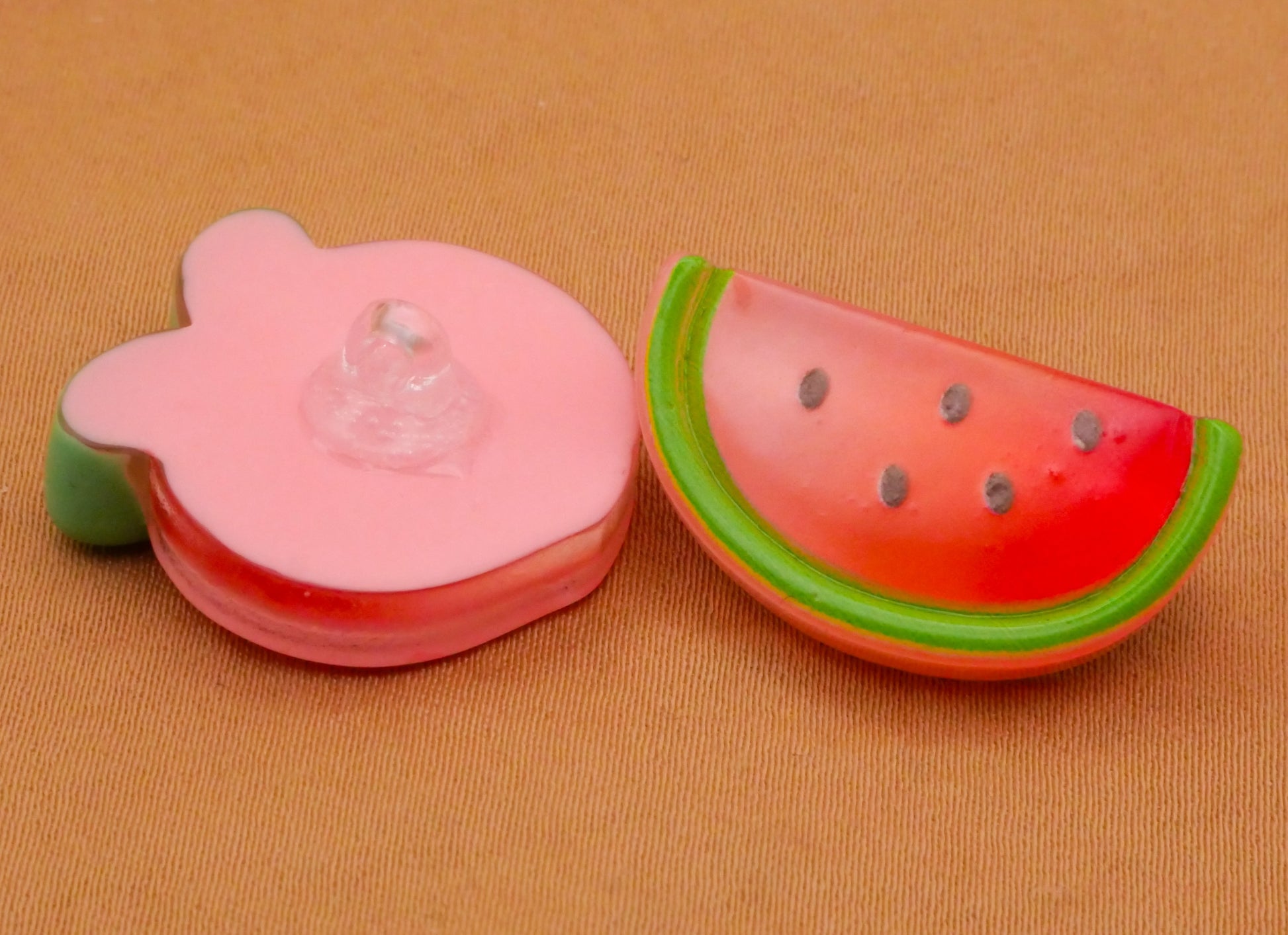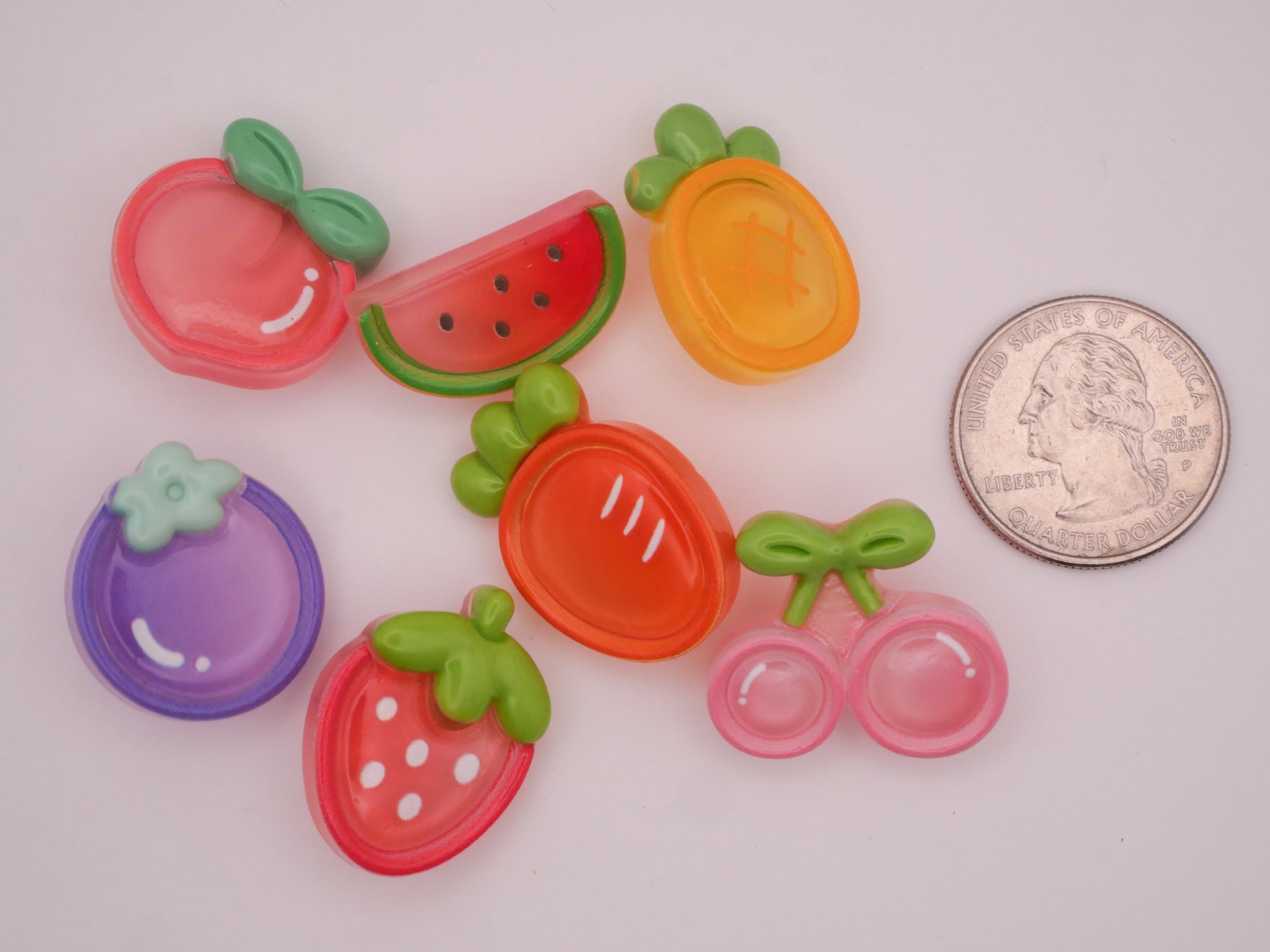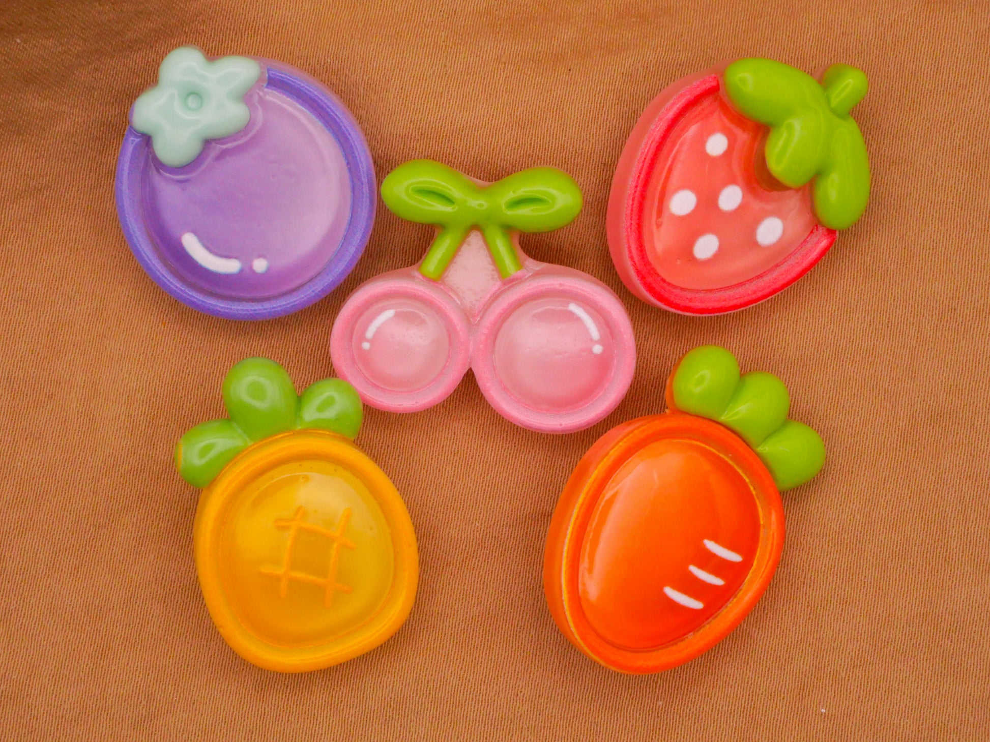 Love these colorful and cute fruit and vegetable buttons! Sold in randomly assorted set of five. These plastic buttons measures between 13-25mm / .51"-.98".