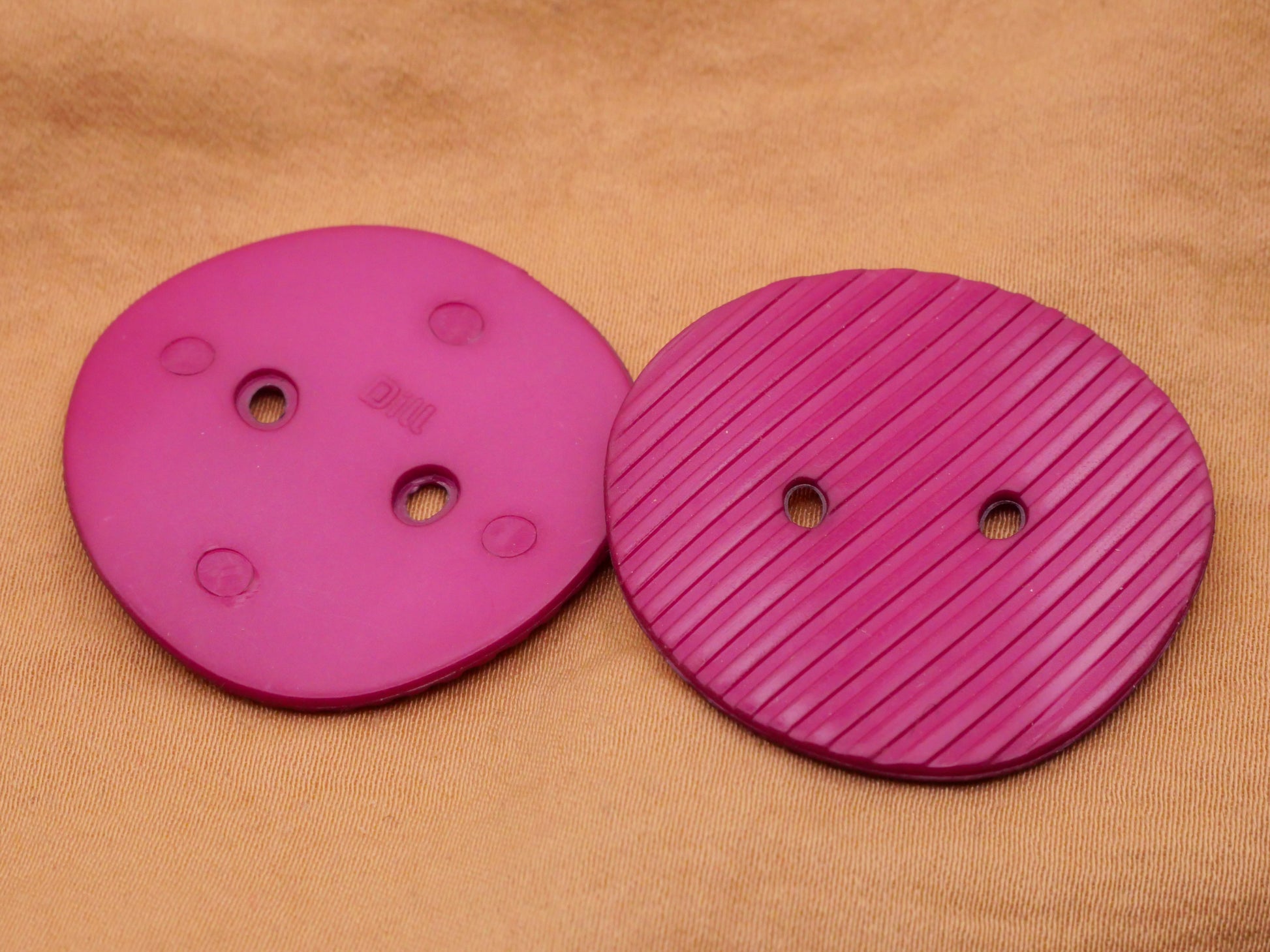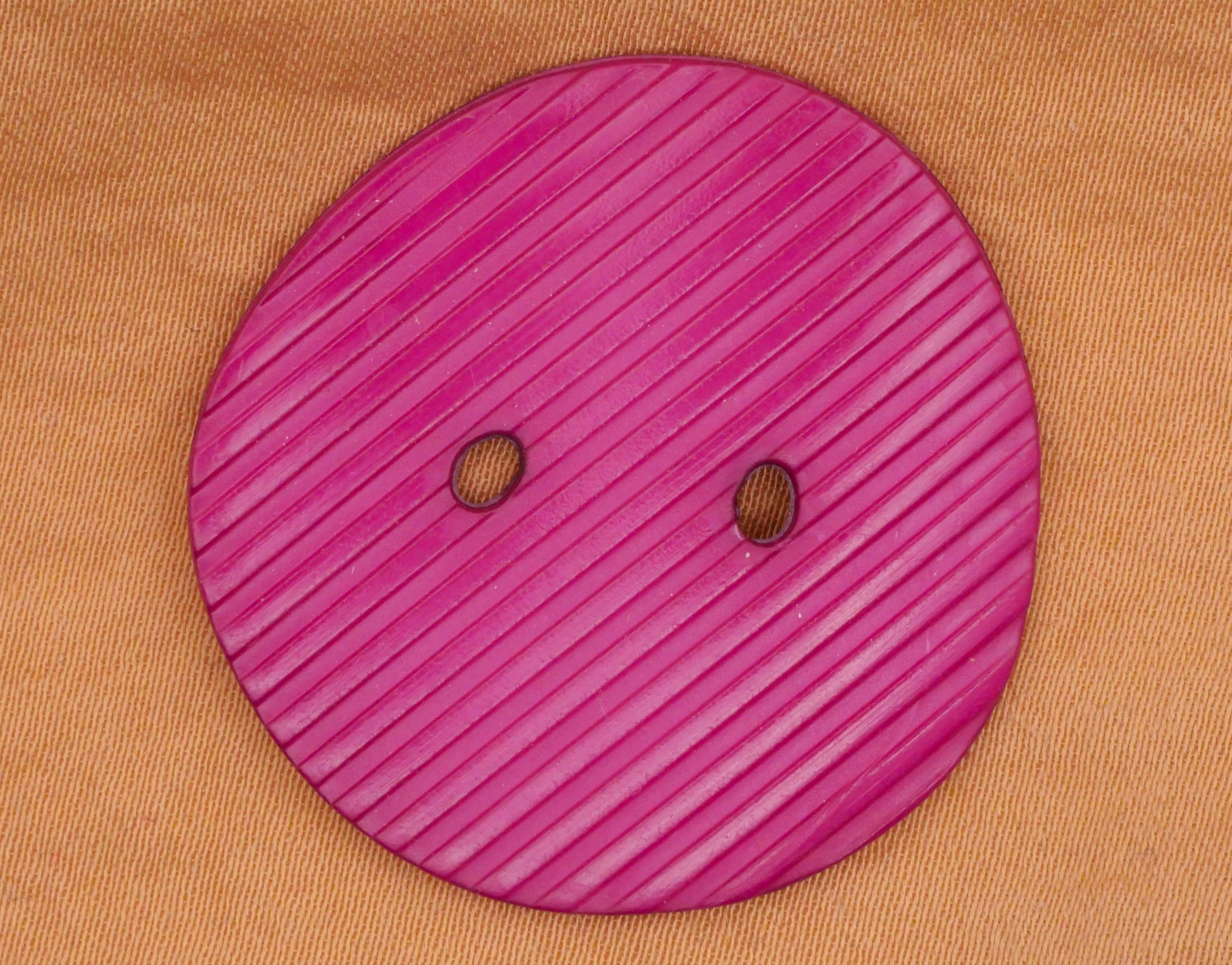 Large fuchsia thin plastic sew-thru buttons by Dill. Sold in pairs. Each button measures 34mm / 1.34" in diameter.