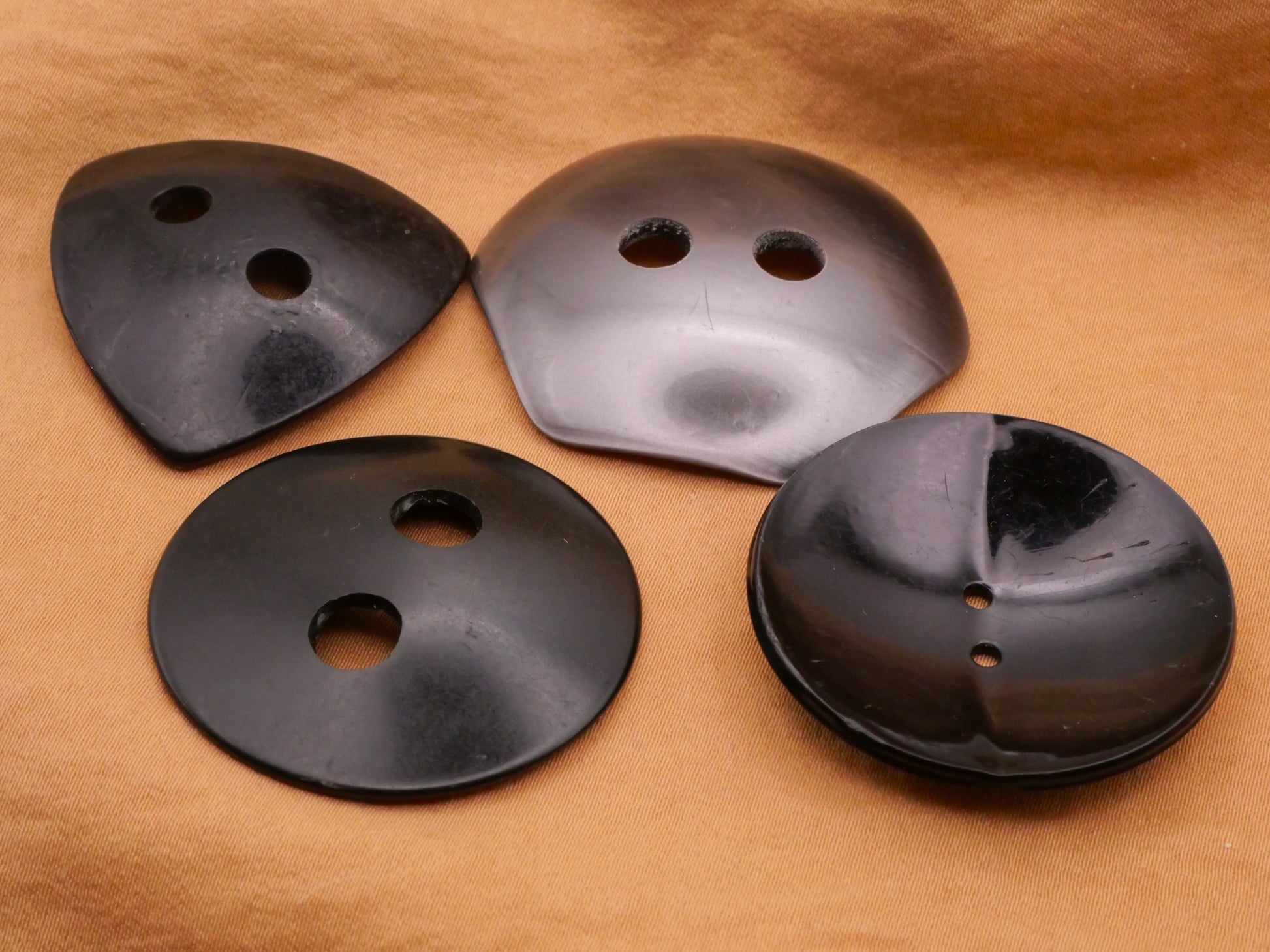 Set of four large geometric vintage plastic buttons. Black and gunmetal colors. Triangular one has some surface scratches. These measure between 35-42mm / 1.38"-1.65".