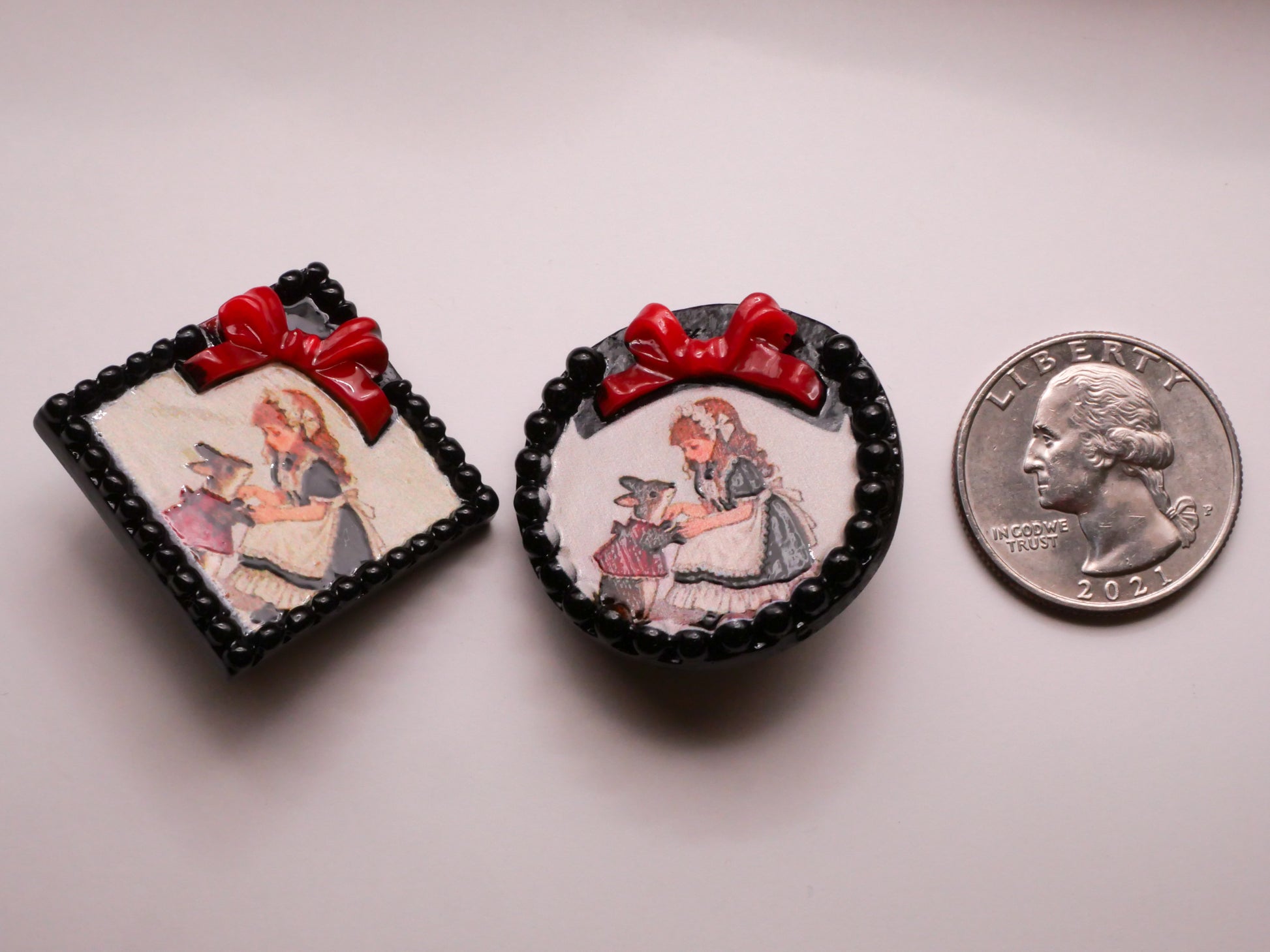 The cutest framed picture look button with girl and bunny rabbit in sweet little outfits. These plastic button measure between 32-37mm / 1.26"-1.46". Choose left or right.