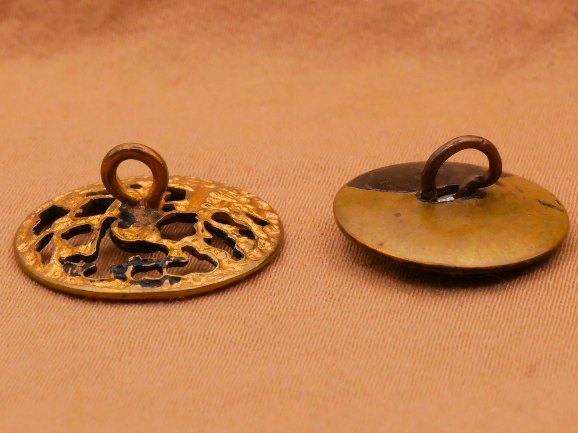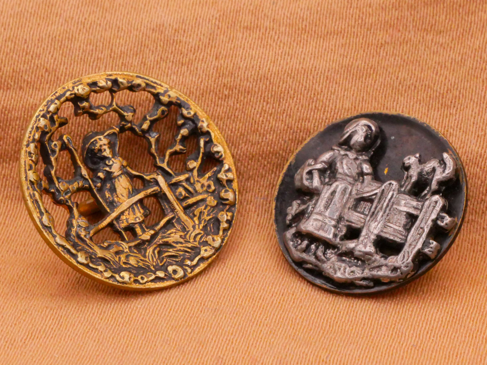 Girl in bonnet at fence scene Victorian metal buttons. Left is Bo Peep by Kate Greenaway and right is tinted steel-cup with girl or lady and cat. These measure between 16-19mm / .63"-.75". Choose left or right.