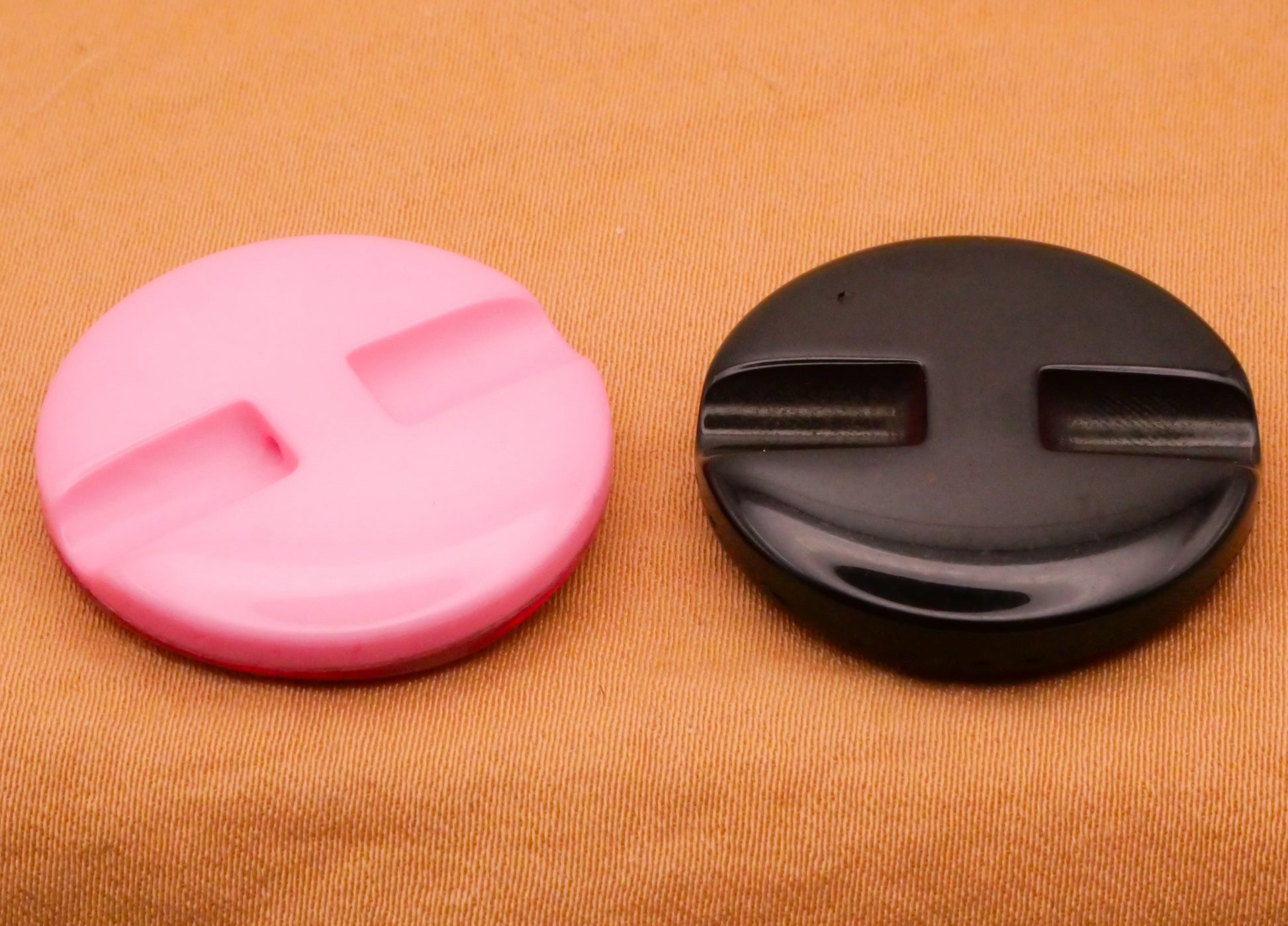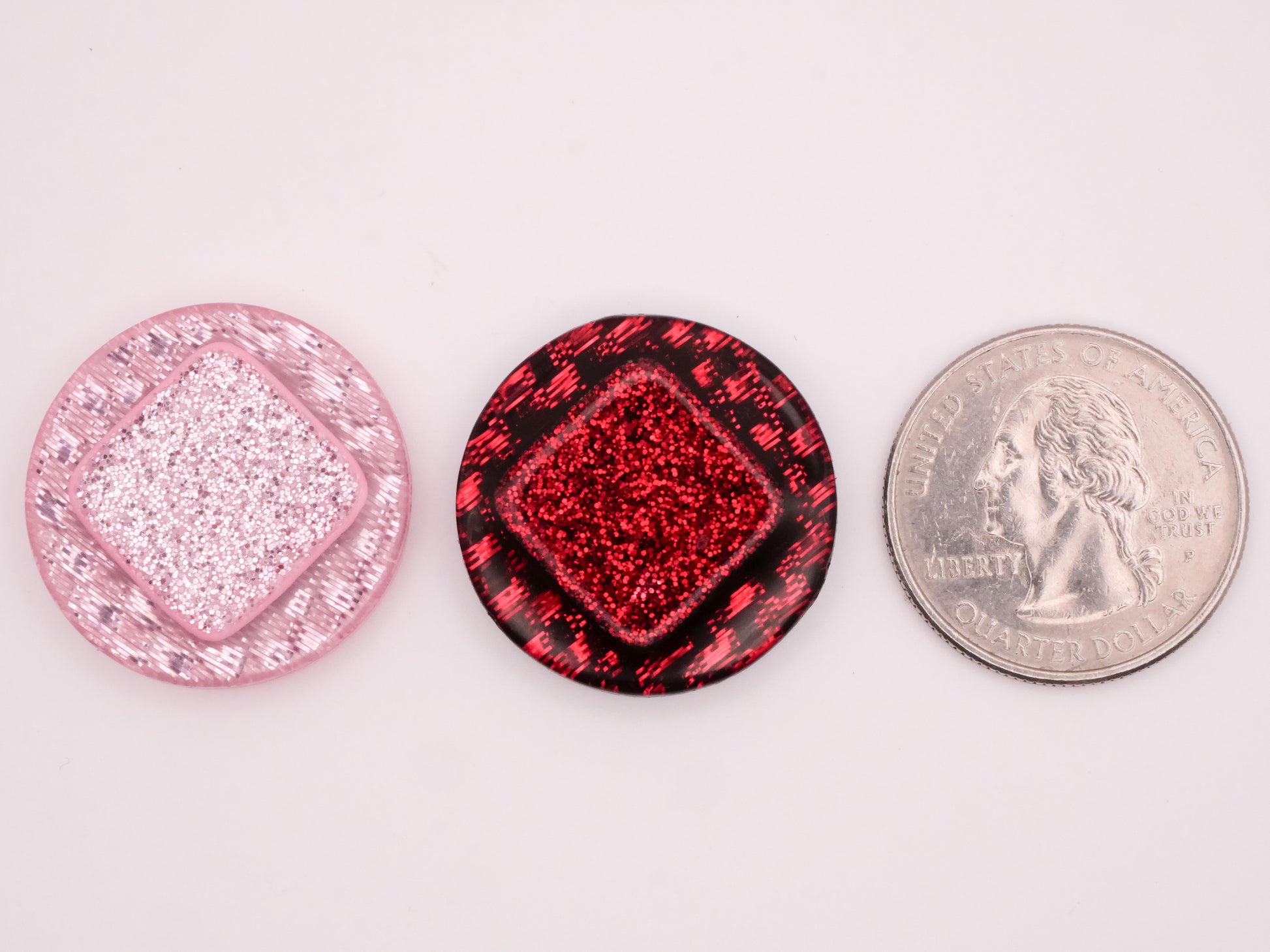 Fabulous glitter and woven fabric design under plastic vintage button in either pink or red. Each button measures 26mm / 1.02" in diameter. Choose pink or red.