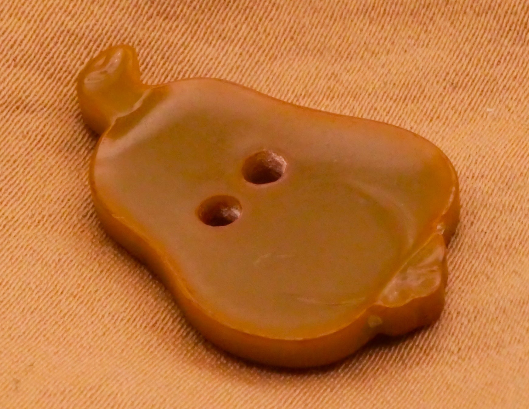 Greenish brown Bakelite gourd or pear sew-thru button. Measures 17 x 27mm / .67" x 1.06".