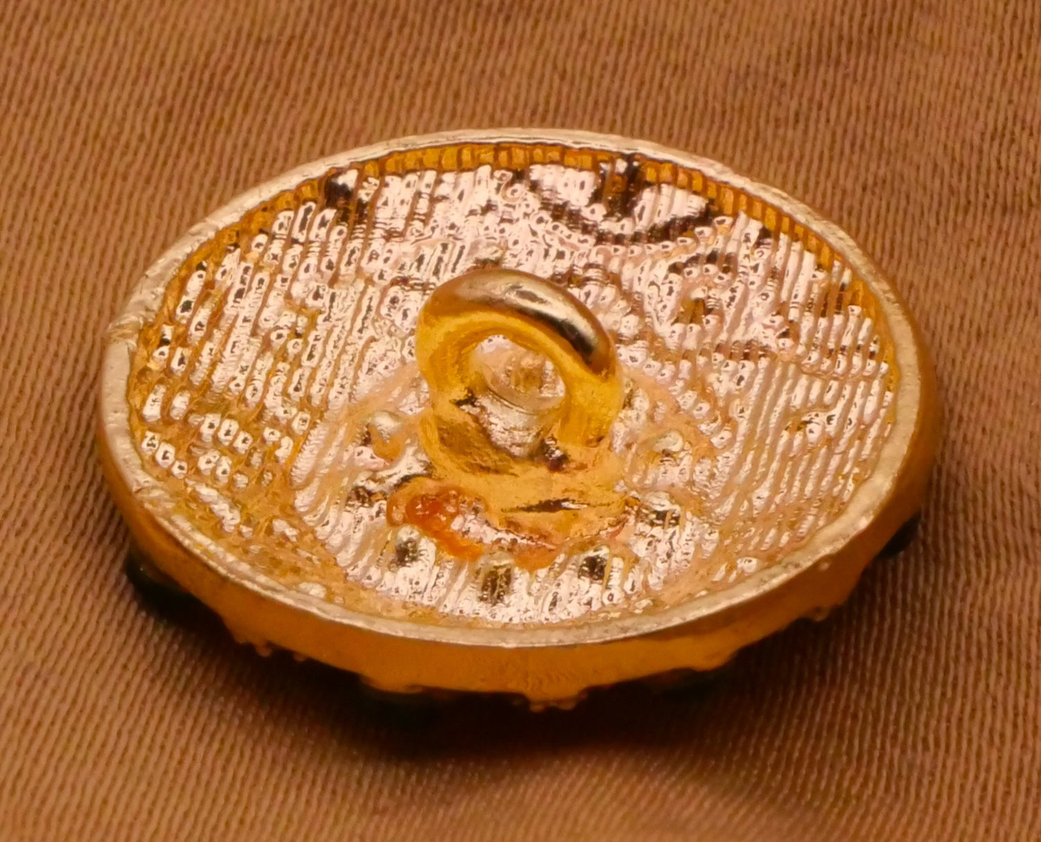 Interesting rhinestone button that looks like a green eye! Also has subtle sun design within the gold metal. Button measures 20mm / .79" in diameter.