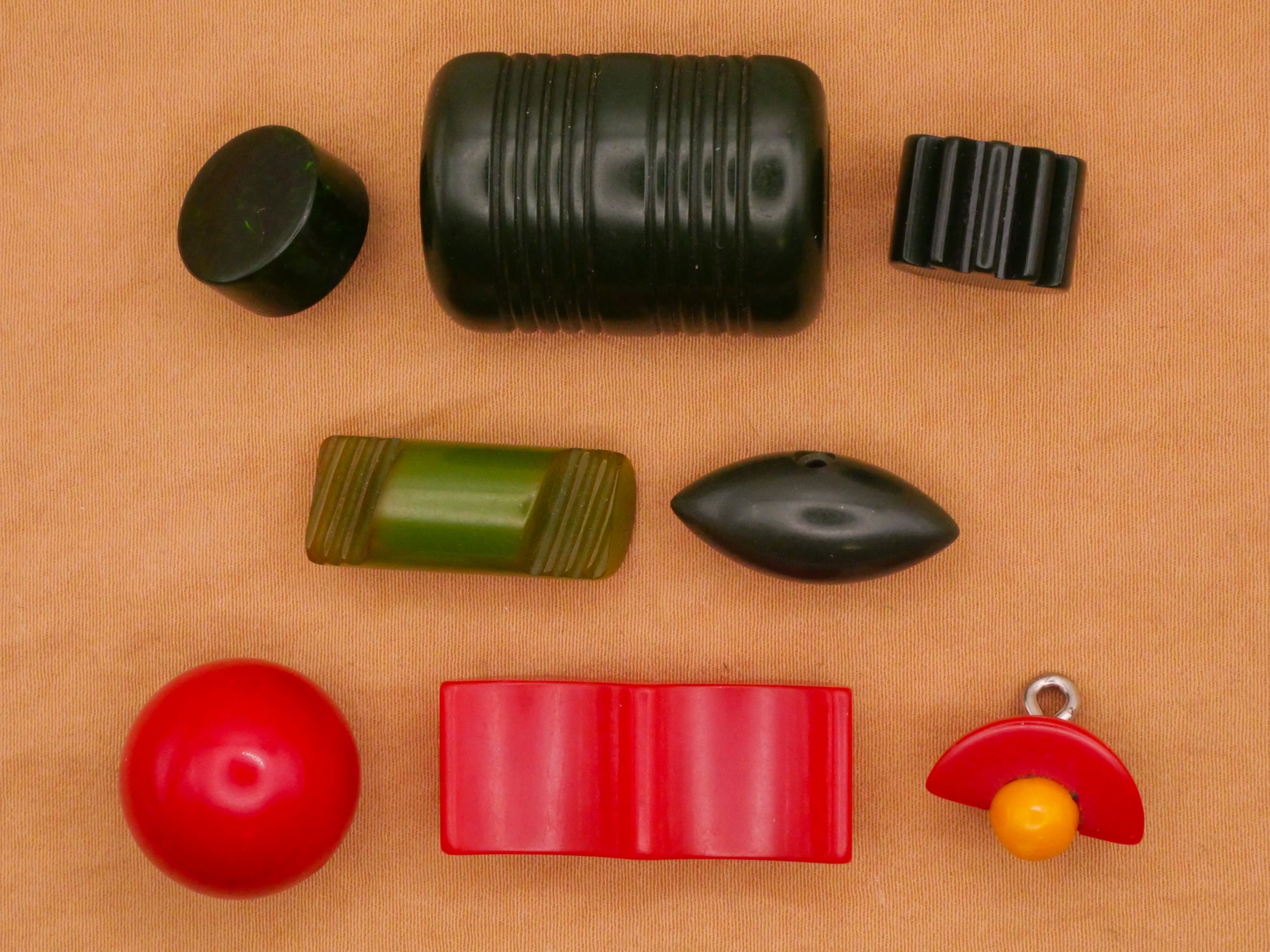 Excellent collection of green and red Bakelite early plastic buttons in various geometric designs. Top left has unusual glittery translucency. Bottom right does show some glue where the yellow meets the red. Some really unusual shapes here! These measure between 9-29mm / .35"-1.14". Choose top, middle, or bottom and left, center, or right.