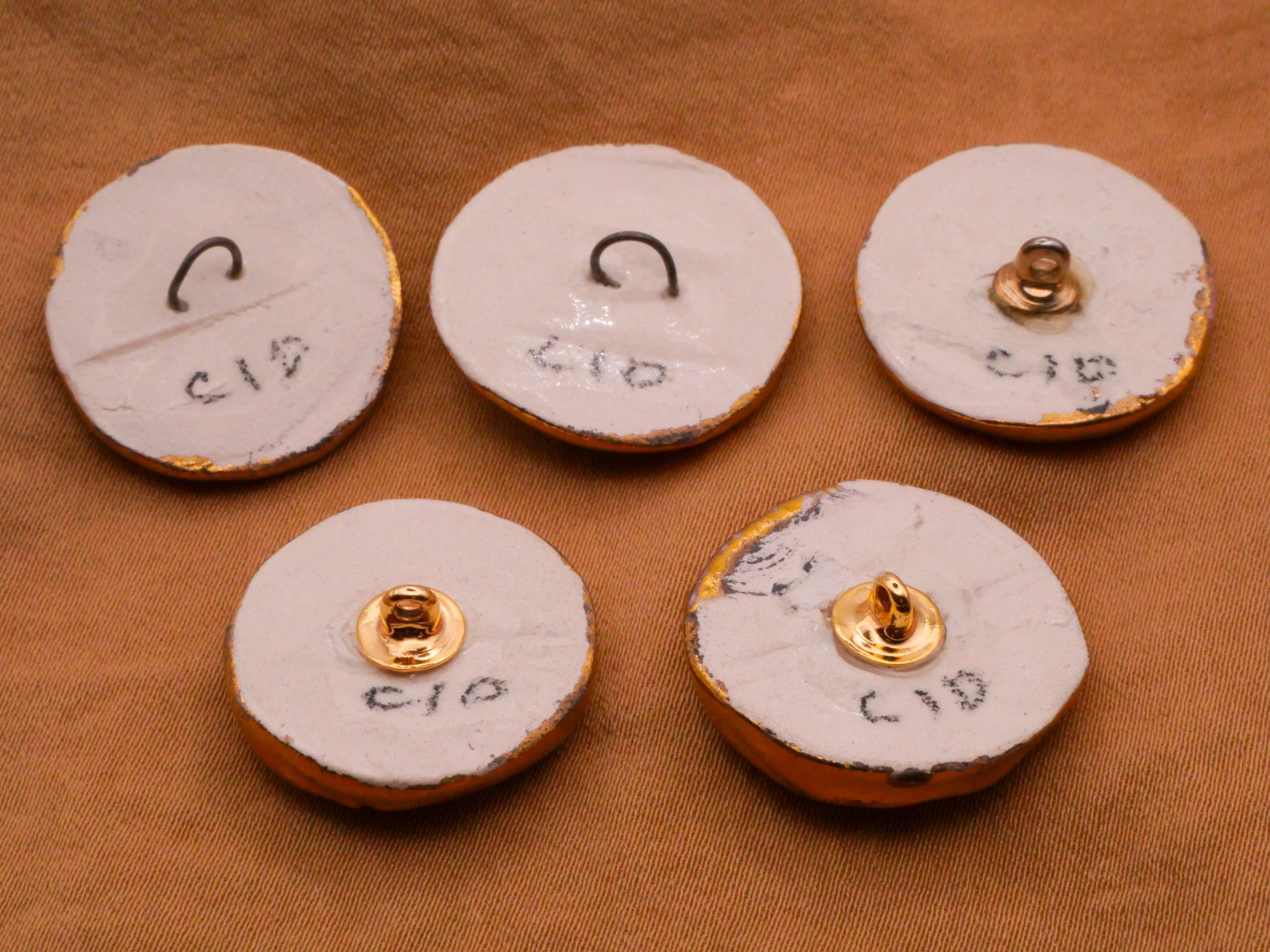 Love! Grumpy man on the moon designs in gold painted ceramic. These studio buttons are made by Cecile Durham and are signed with her initials on the back. Some of these have replaced shanks and see photos for paint condition on front. These measure approx 21mm / .83" across. Choose top or bottom and left, center, or right.