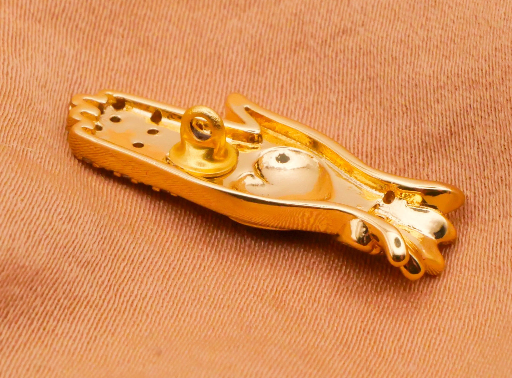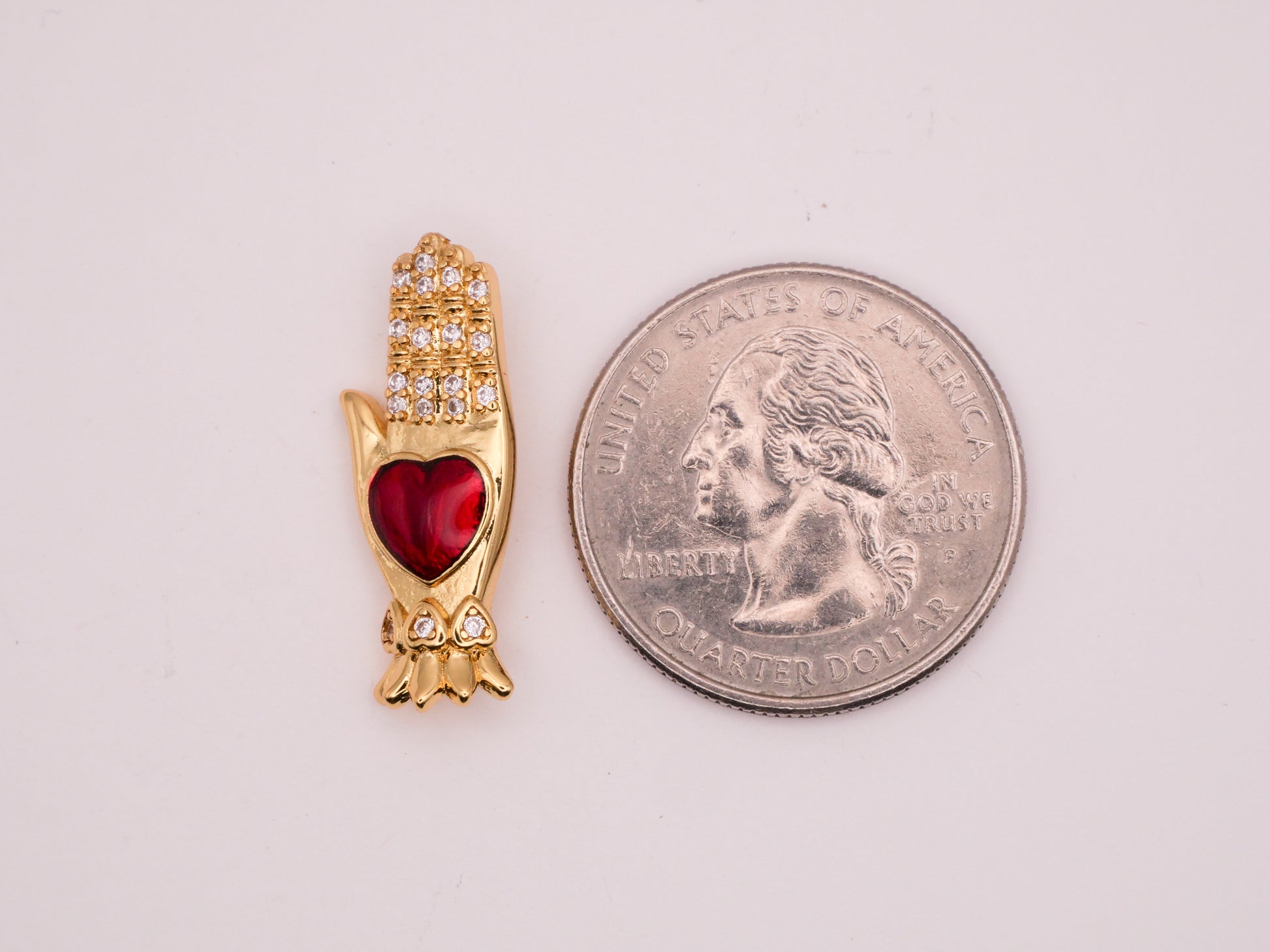 Wow! Amazing gold metal hand button with red enamel heart in the center and rows of rhinestones on the fingers. Love this! Measures 10 x 25mm / .39" x .98".