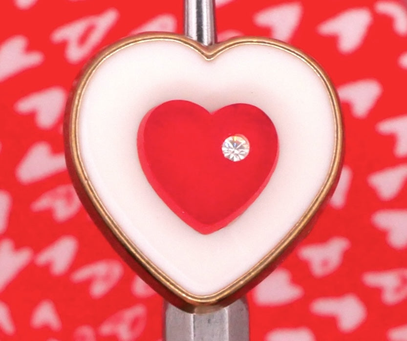 Really lovely vintage button! This gold metal and off-white enamel button has a red frosted glass heart in the center. It's even graced with a tiny rhinestone! So sweet! Measures 16mm / .63" across.