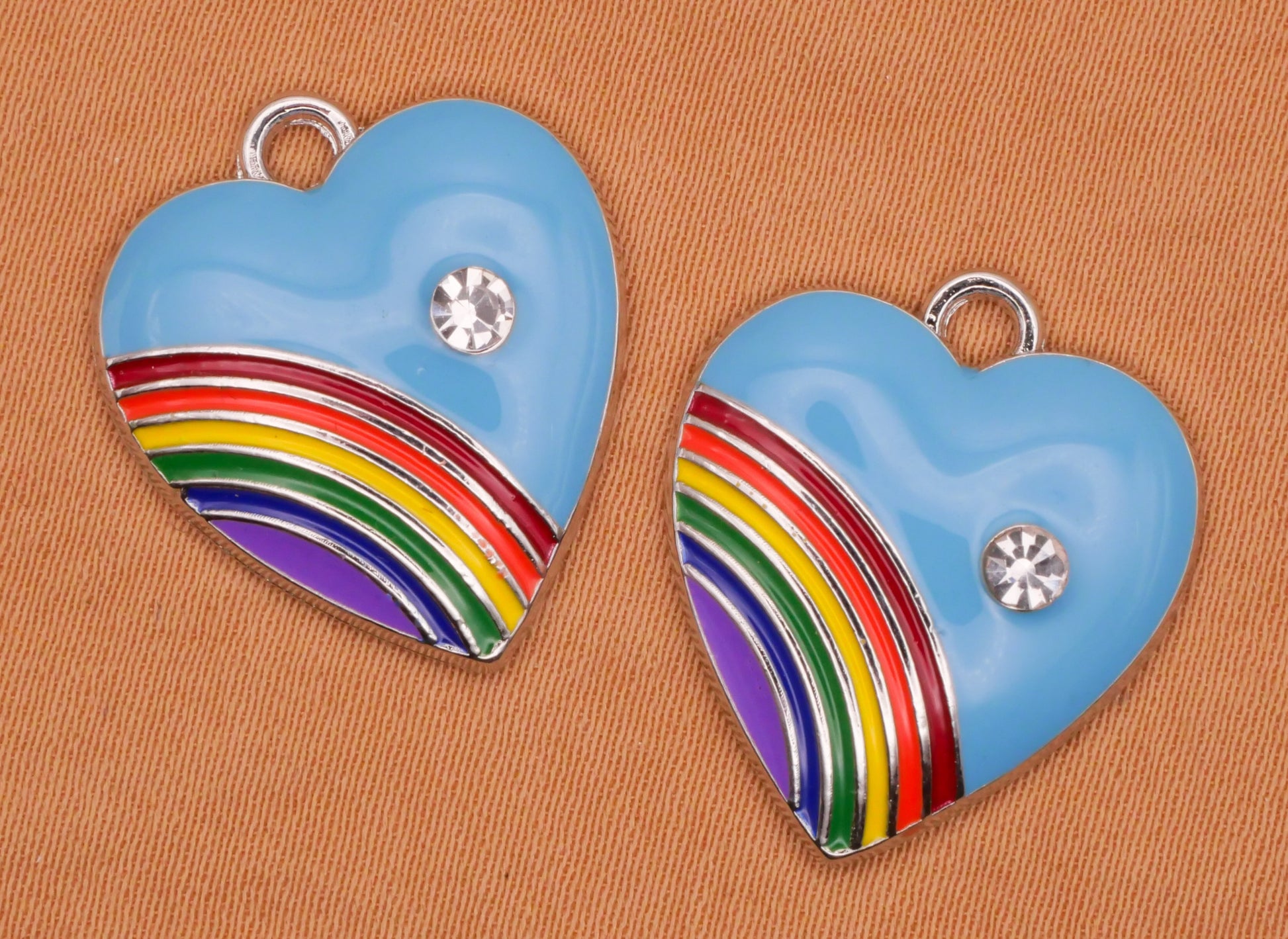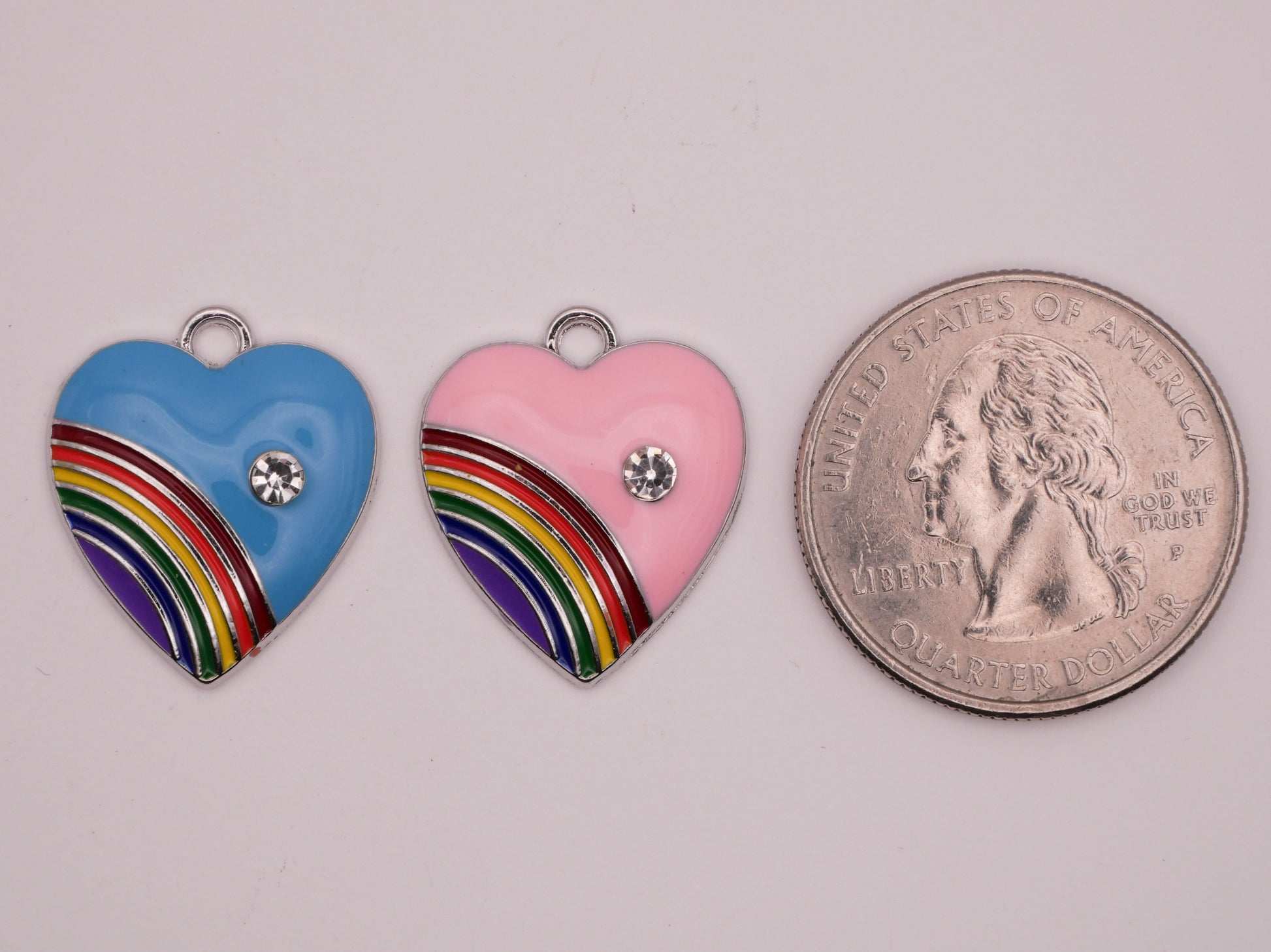 Fun rainbow heart enamel metal charms with rhinestones. Sold in pair. Each measures 18 x 21mm / .71" x .83". Choose blue or pink.