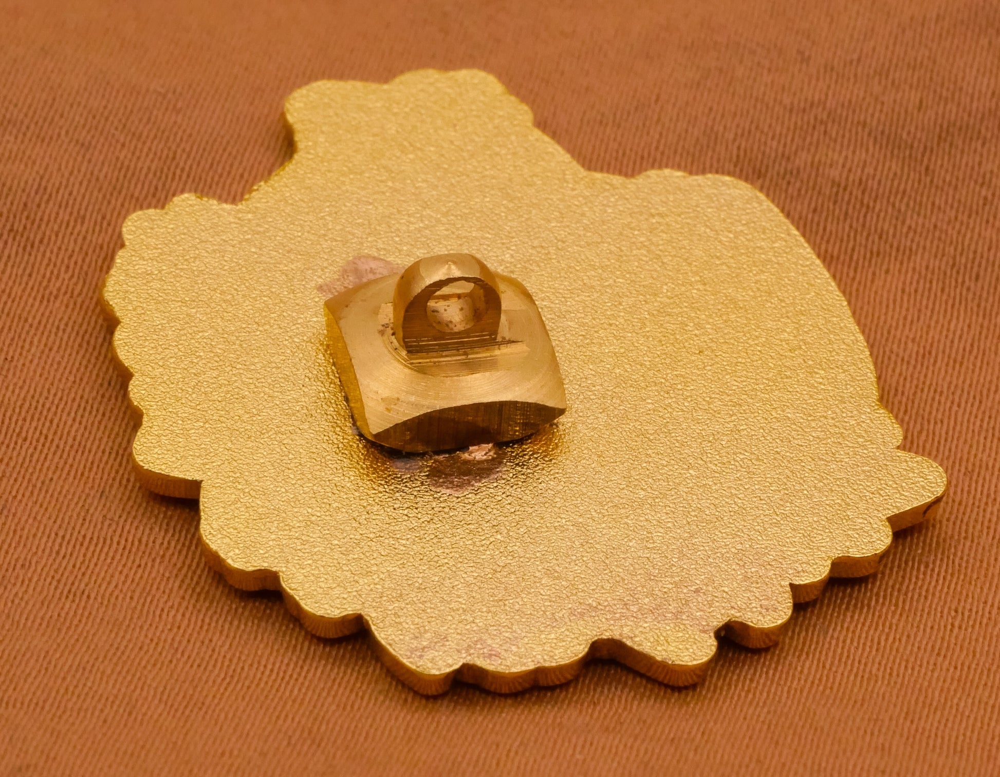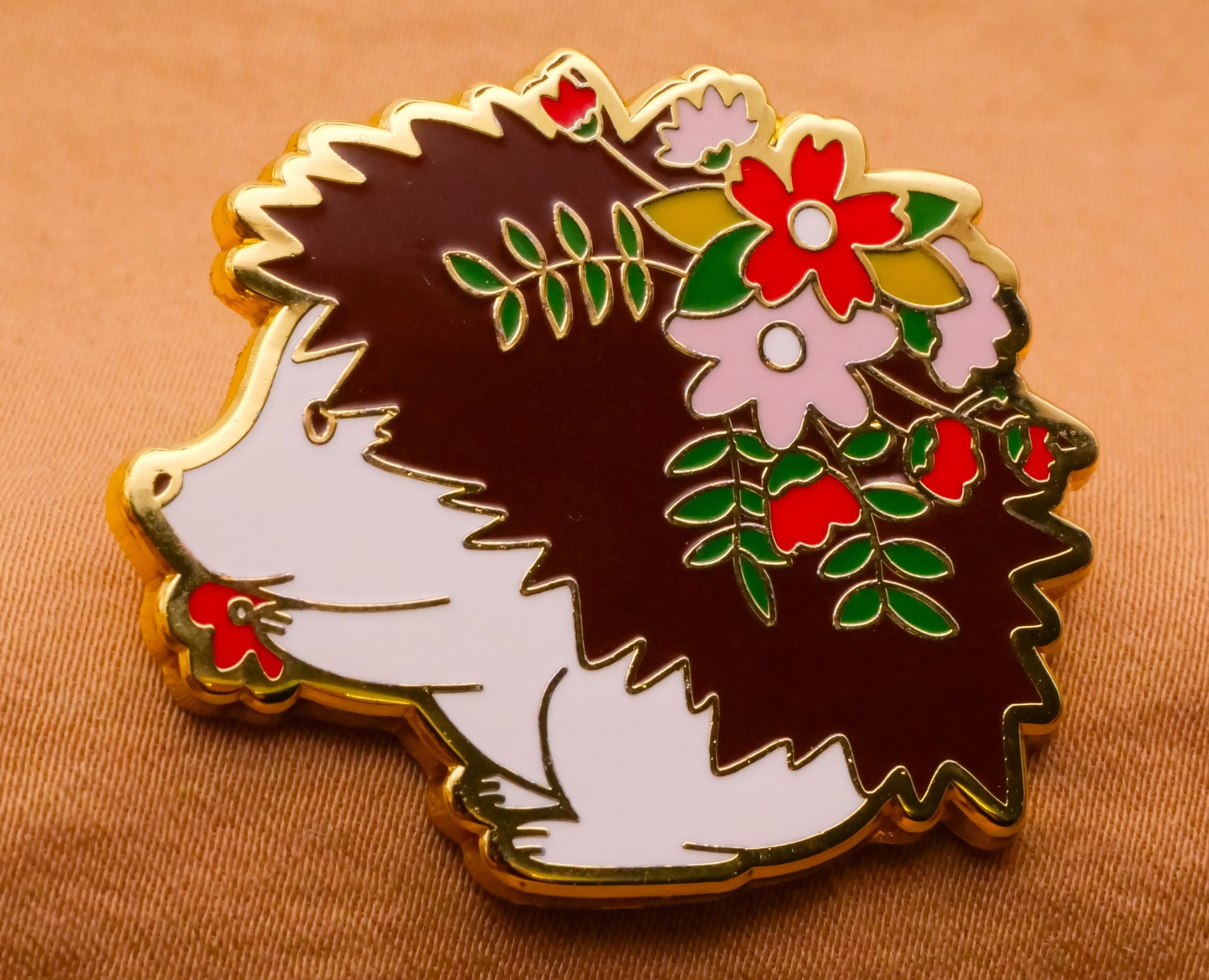 Precious hedgehog with flowers enamel metal button in gold. Measures a large 30 x 35mm / 1.18" x 1.38".