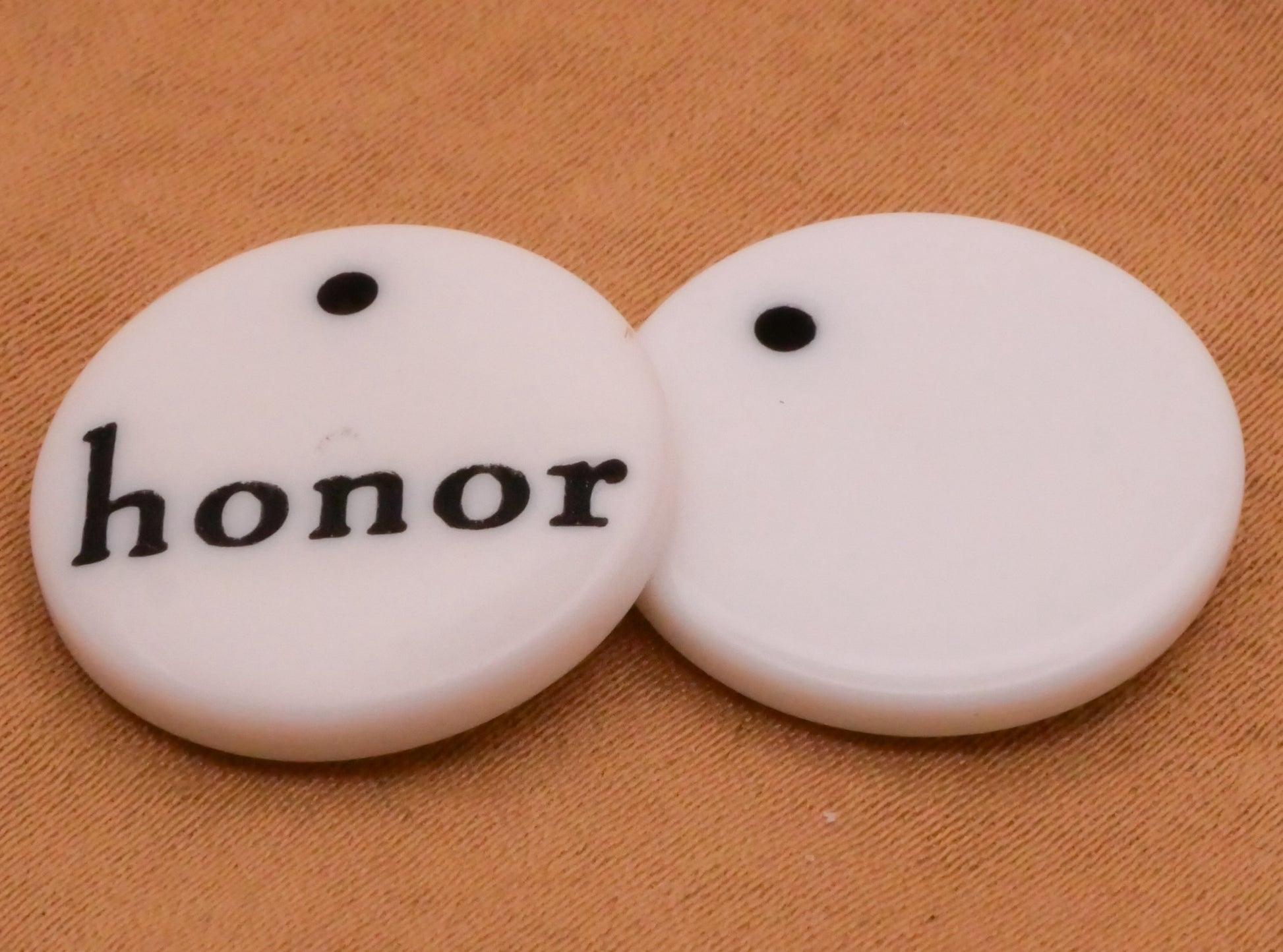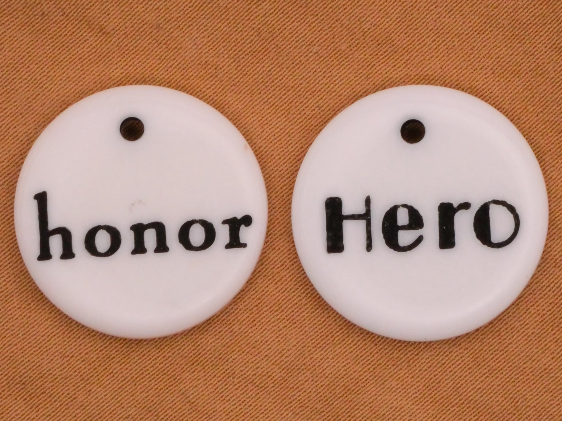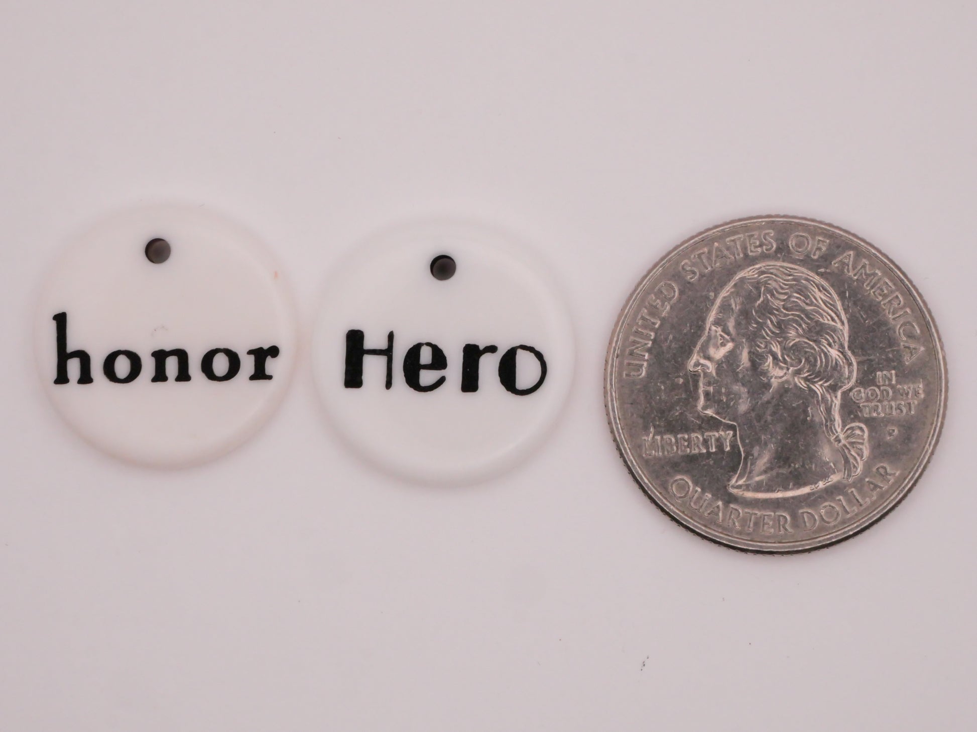 "Honor" and "Hero" plastic embellishments / charms. Each measures 19mm / .75" across. Choose honor or hero.