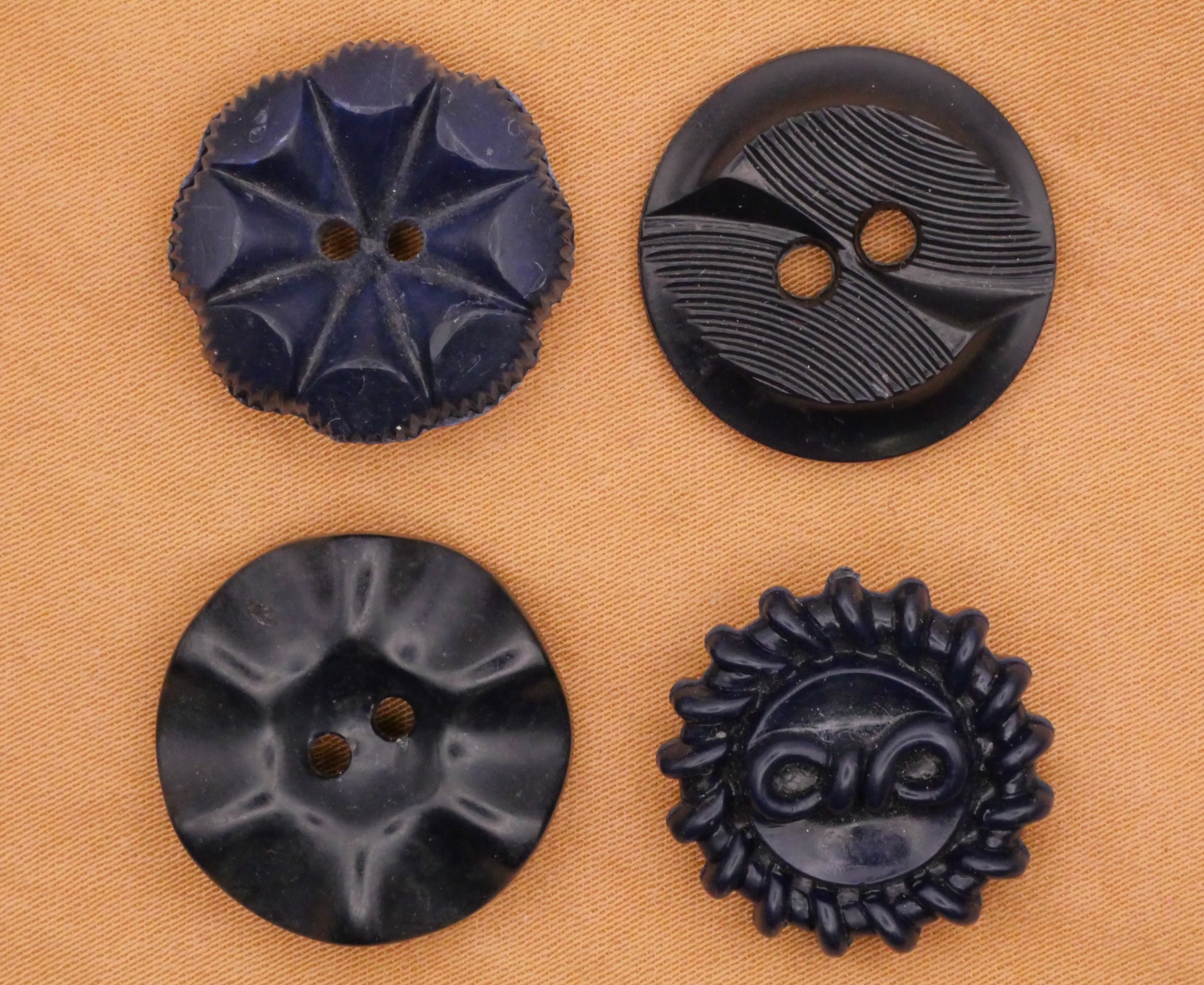 Handsome navy blue housecoat vintage plastic buttons, choose your favorite design! These measure between 18-19mm / .71"-.75". Choose top or bottom and left or right.