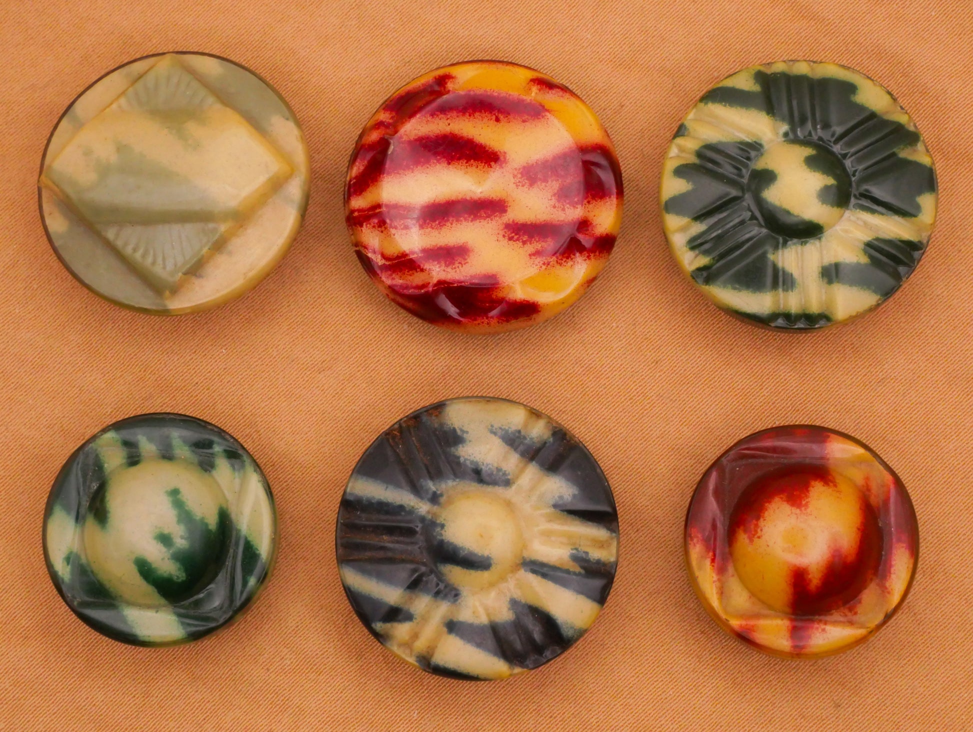 Amazing selection of ikat design look celluloid early plastic buttons. Love the variety of subtle raised designs as well. These measure between 19-23mm / .75"-.91". Choose top or bottom and left, center, or right.
