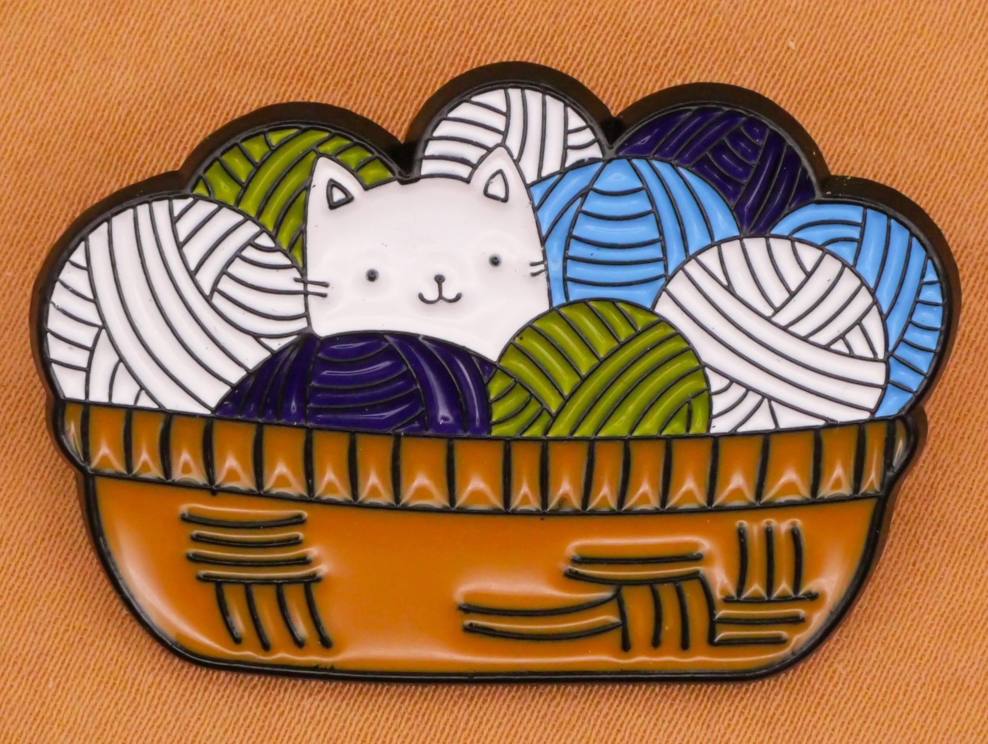Darling kitty cat in a basket of yarn balls, so cute! Enamel and metal button measures a large 27 x 39mm / 1.06" x 1.54".