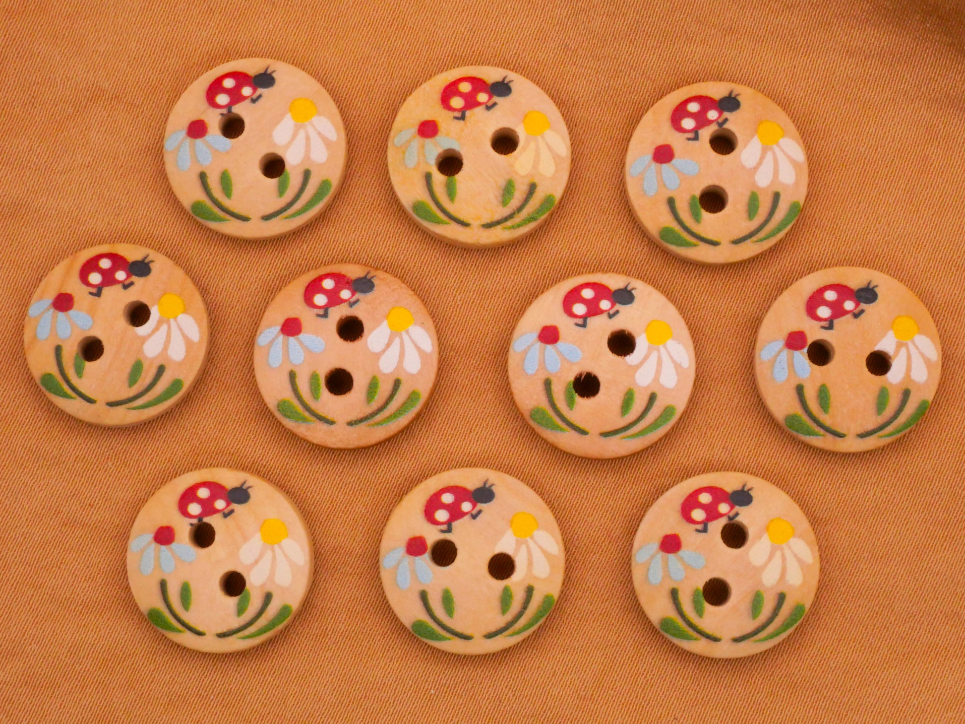 LOVE! Ladybug and daisies on wood sew-thru button. Sold in set of ten. Each button measures 15mm / .59" in diameter.