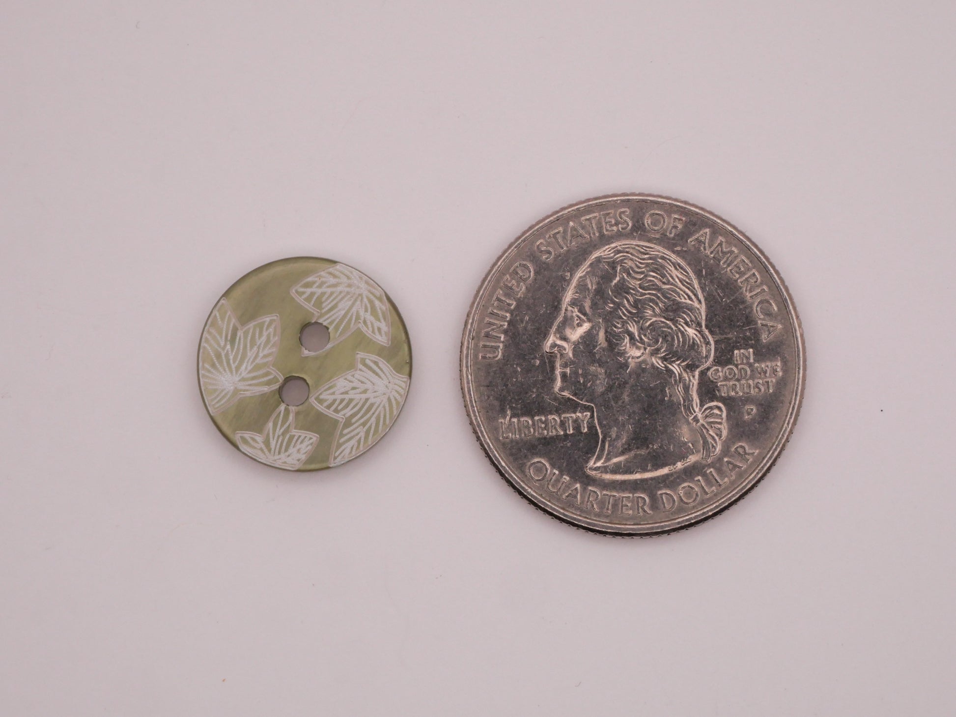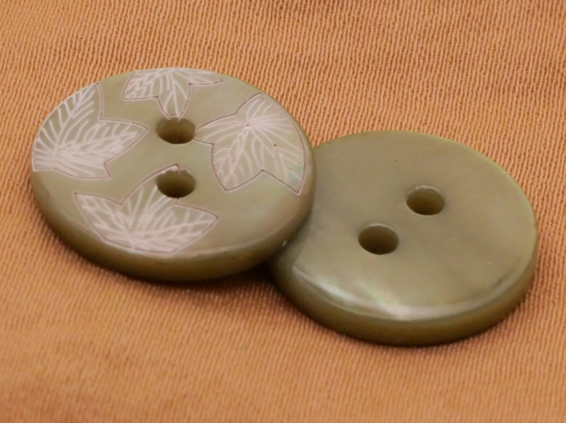 Lovely sage green dyed shell buttons with etched leaf design. Sold in set of three. Each button measures 15mm / .59" in diameter.