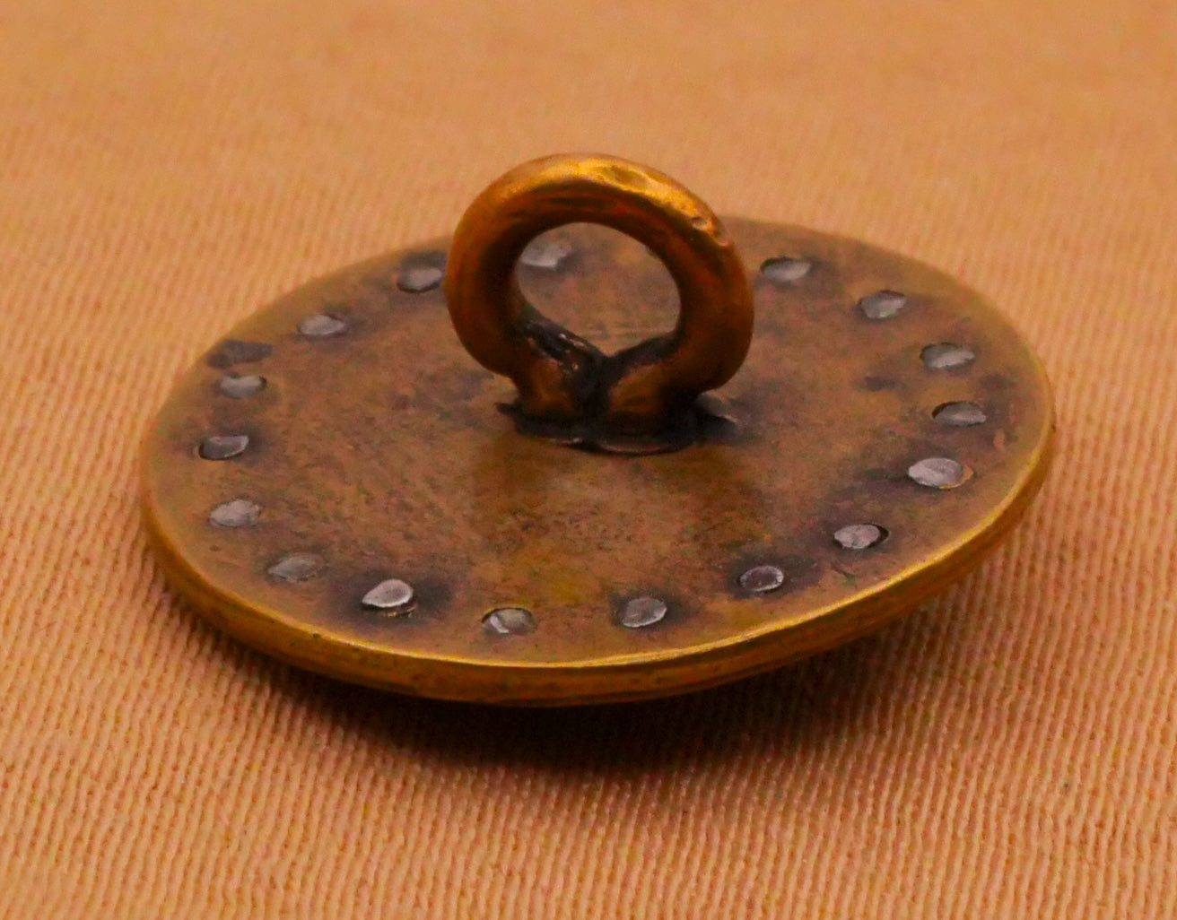 Amazing etched brass metal leaf leaves design with brown tinted background and surrounded in steel cuts! Excellent condition metal buttons measures 17mm / .67" in diameter.