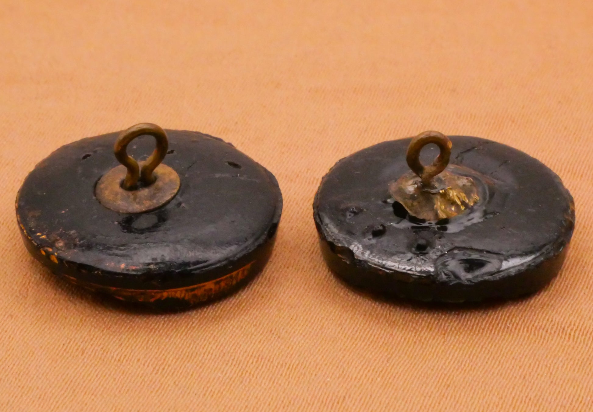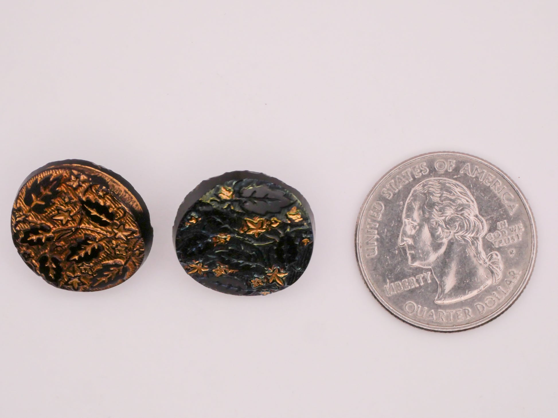 Gorgeous leaf leaves design antique black glass buttons. Left has gold luster and right has blue tint and gold luster. Each measures 19mm / .75". Choose left or right.