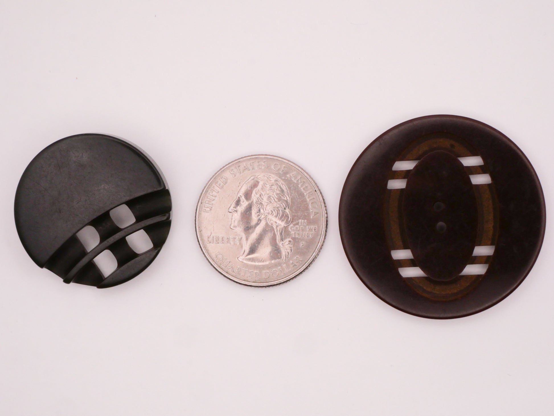 Interesting Bakelite early plastic buttons with machine cuts on both sides. Left is dark green and right is brown. These measure between 28-36mm / 1.1"-1.42". Choose left or right.