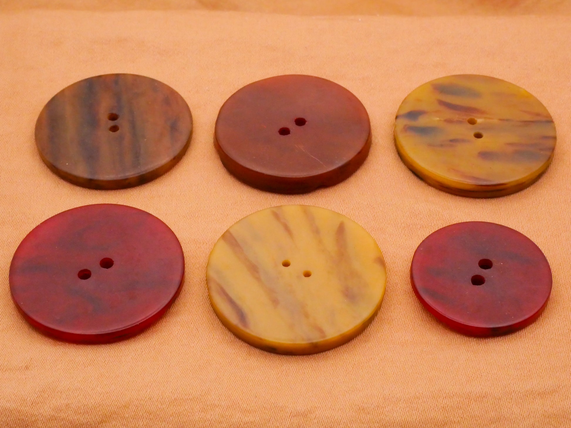 Lovely selection of early plastic buttons with marbled and machine cut designs. These measure between 22-28mm / .87"-1.1". Choose top or bottom and left, center, or right.