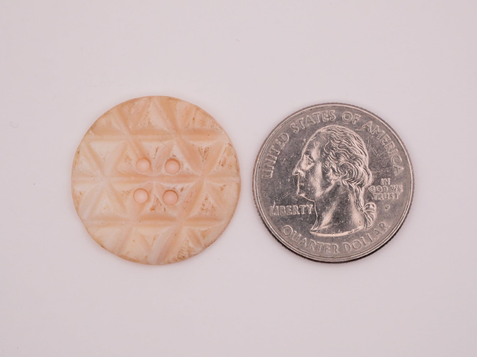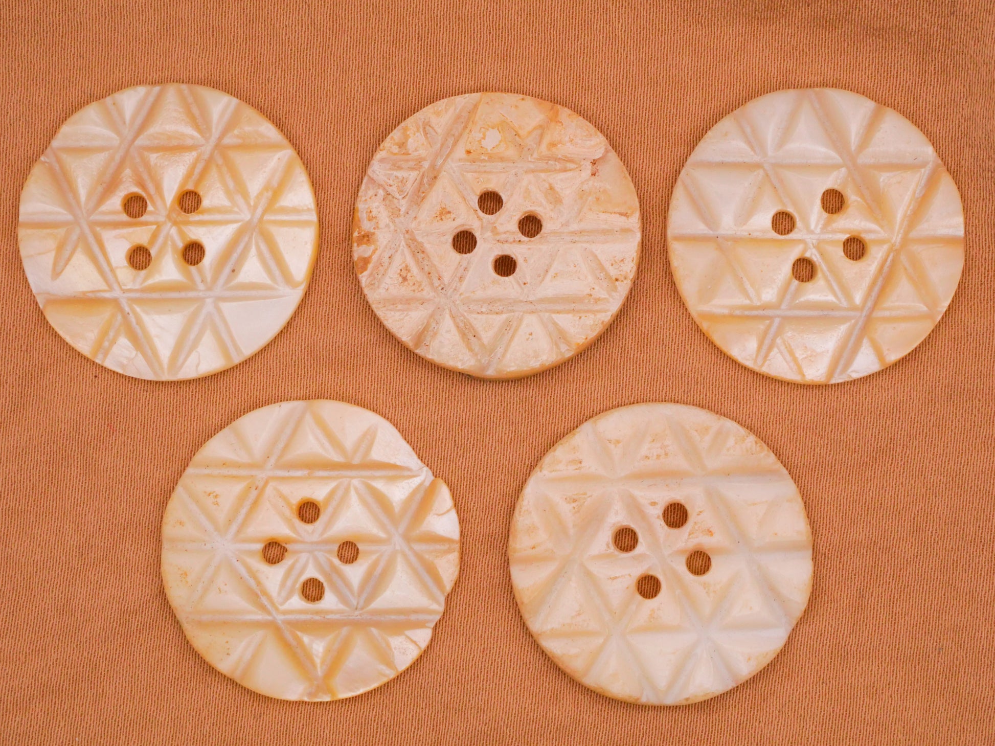 Beautiful carved mother of pearl buttons with design that looks like a Star of David. Also reminded me of quilt designs. Sold individually. Each measures 26mm / 1.02" in diameter. Each varies so please specify which you'd like.