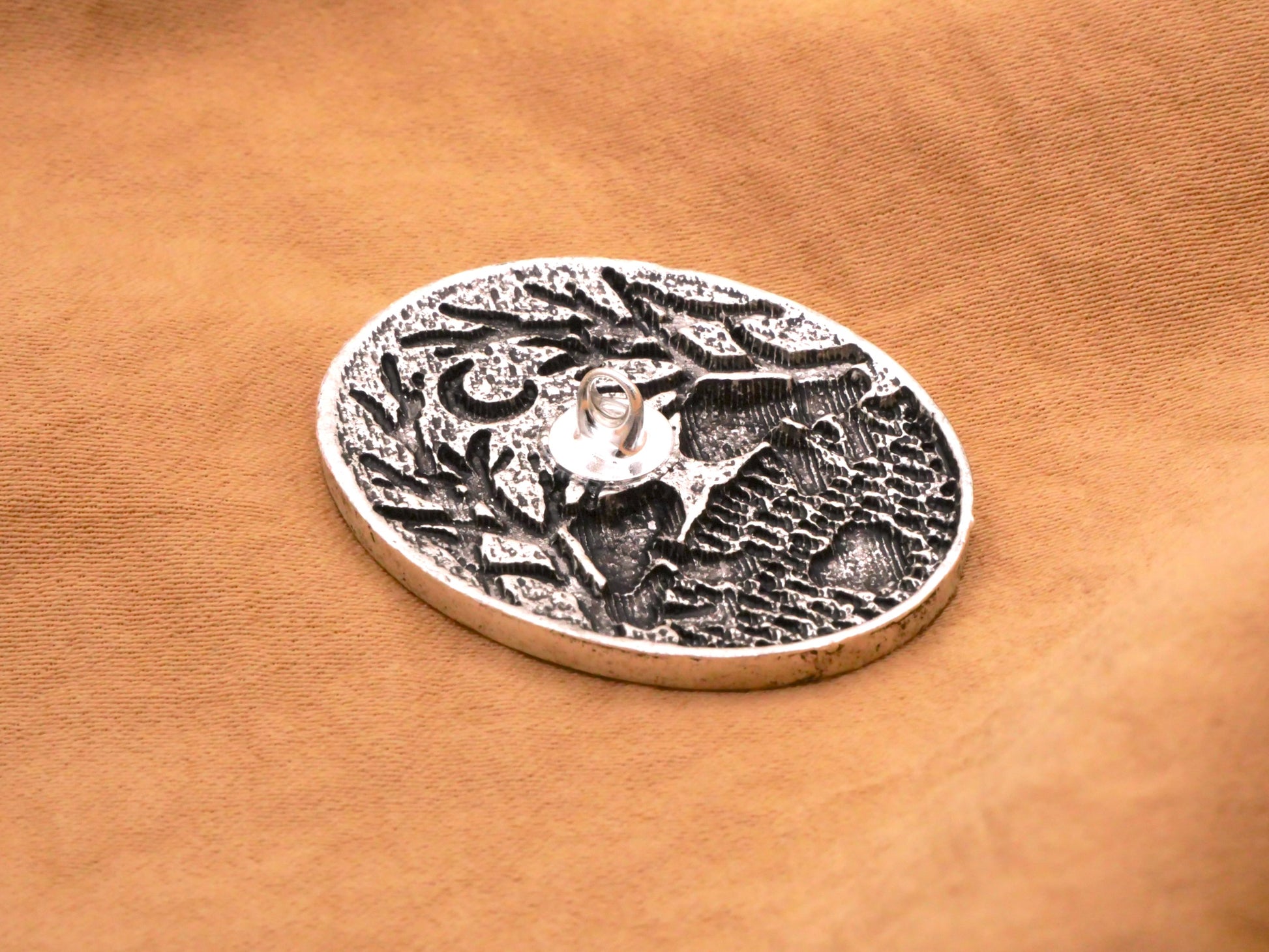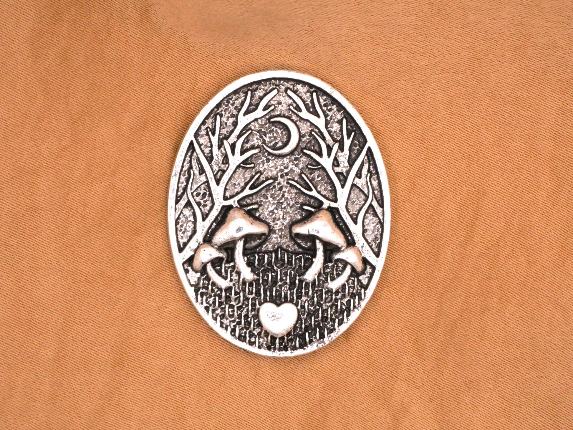 Finding a mushroom in the forest is considered lucky indeed to many people in Germany throughout history. This lovely button features forest mushrooms, a moon, and a heart! Measures 26 x 34mm / 1.02" x 1.34".