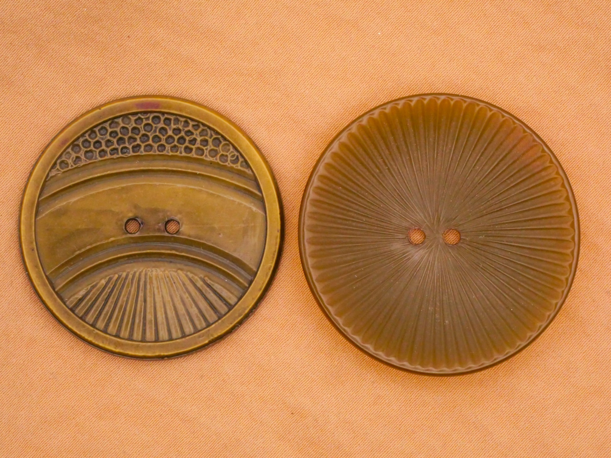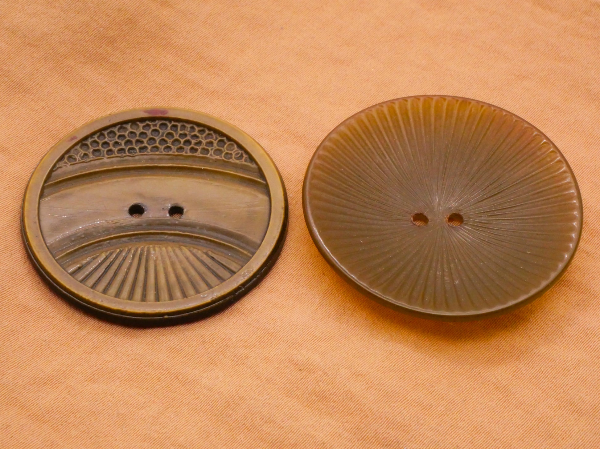 Very cool olive green vintage plastic buttons with deco array designs. Right tested positive for Bakelite. These are large buttons and measure between 36-37mm / 1.41"-1.46". Choose left or right.