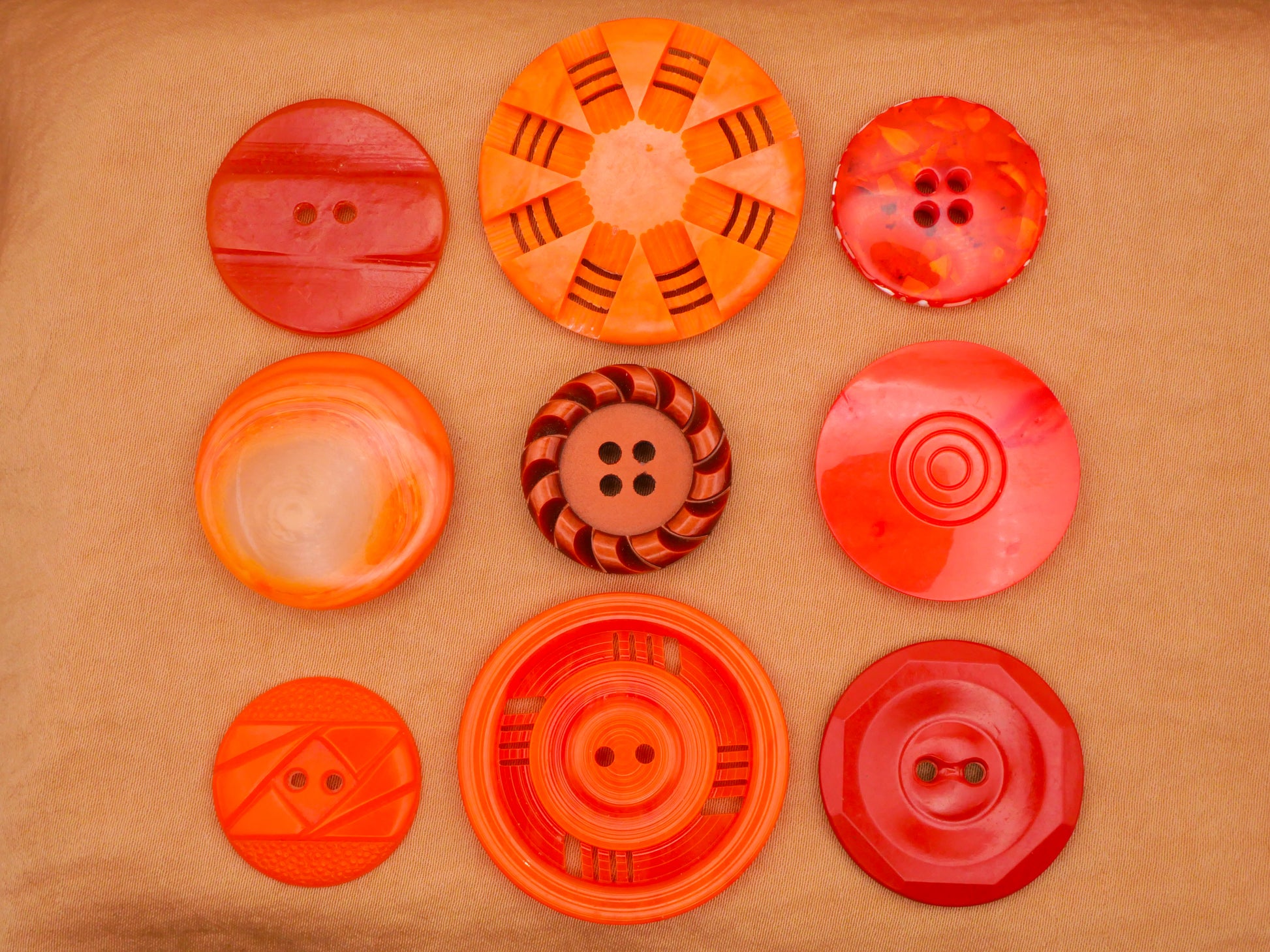 Lovely selection of vintage plastic buttons in various shades of orange, choose your favorite! These measure between 21-35mm / .83"-1.38" in diameter. Choose top, middle, or bottom, and left, center, or right.