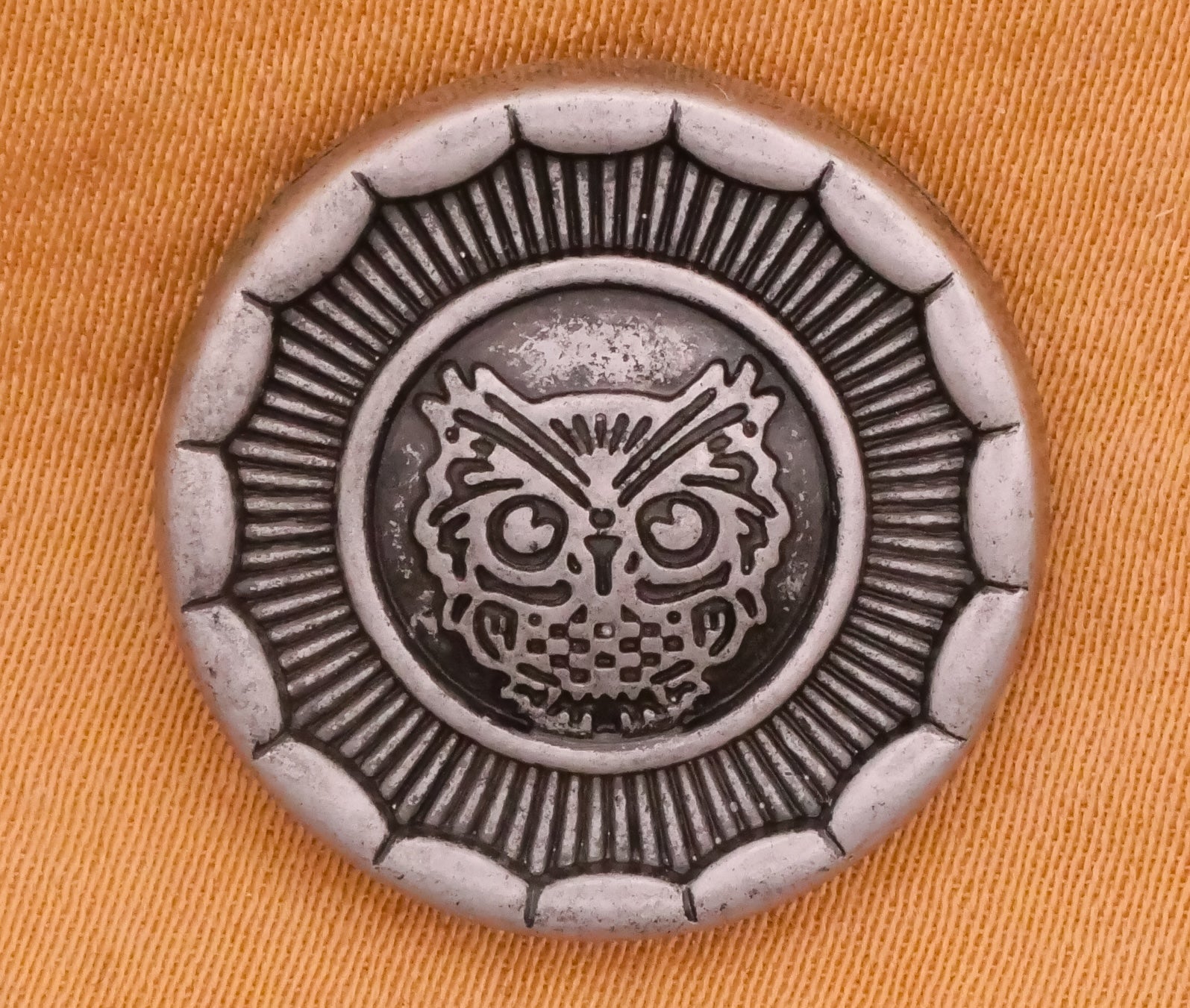 Awesome antiqued silver metal owl button. Sold in pairs. Each button measures 20mm / .79" in diameter.