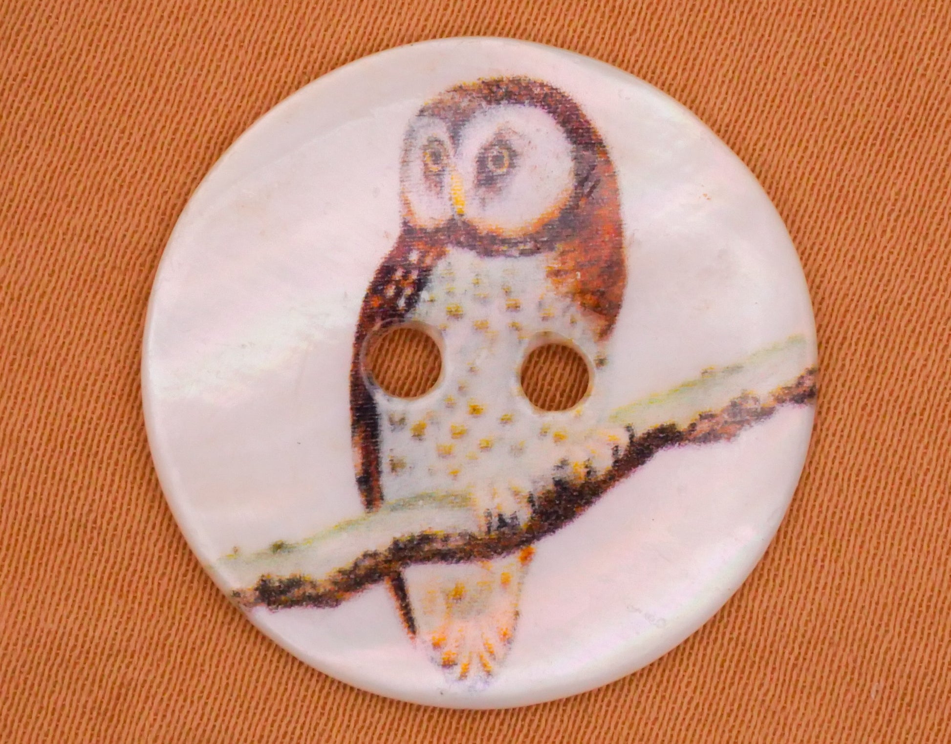 Darling owl bird on branch design on this mother of pearl shell sew-thru button. Measures 25mm / .98" in diameter.