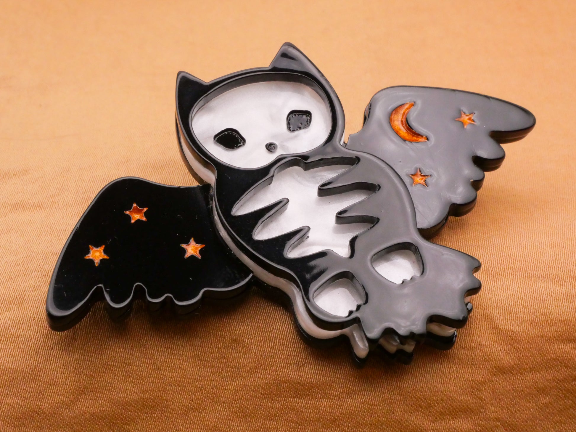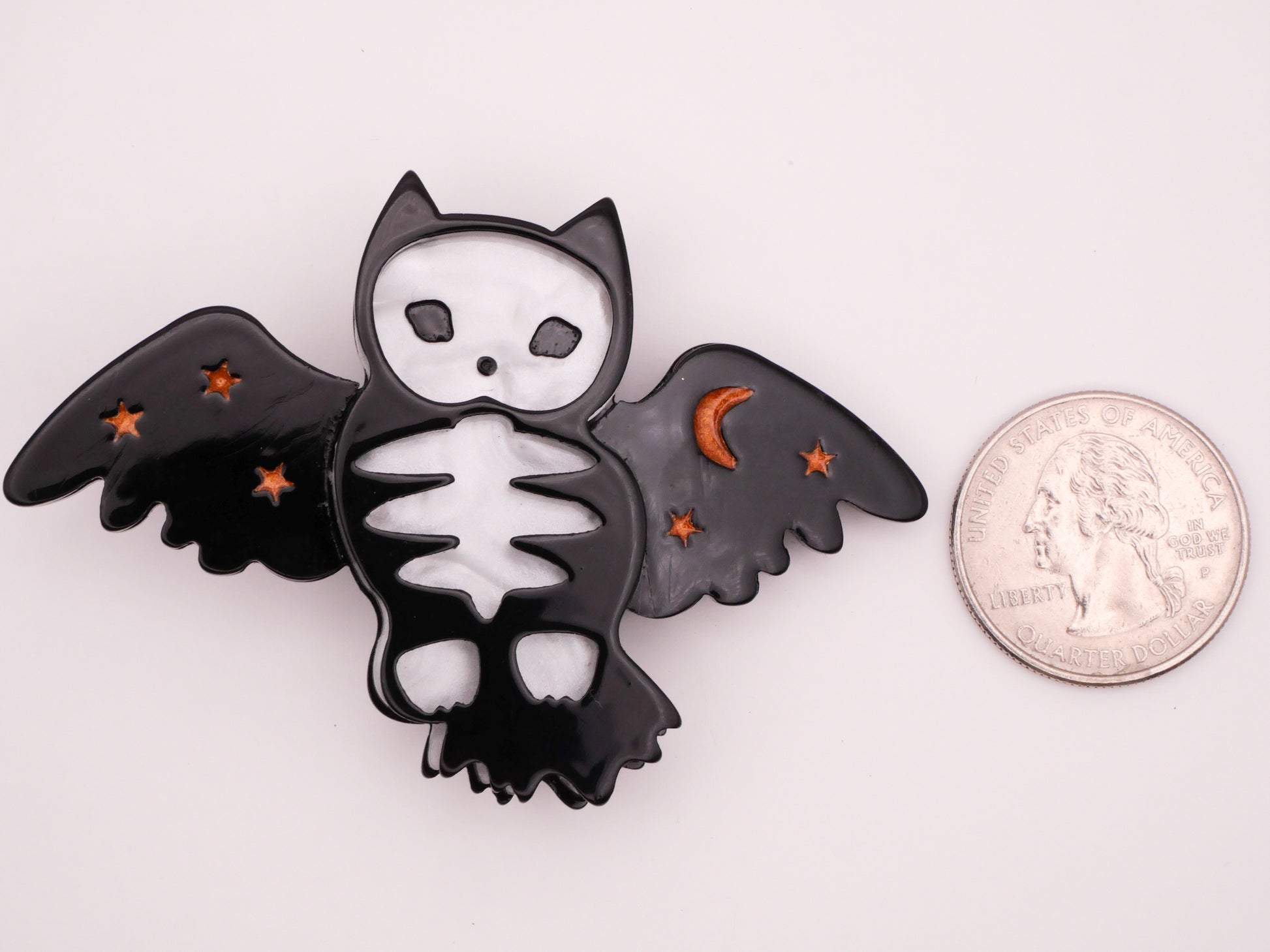 Wow! Amazing owl bird skeleton design acrylic button with stars and a crescent moon on it's wings. So cool! Large plastic button measures 49mm x 73mm / 1.93" x 2.87".