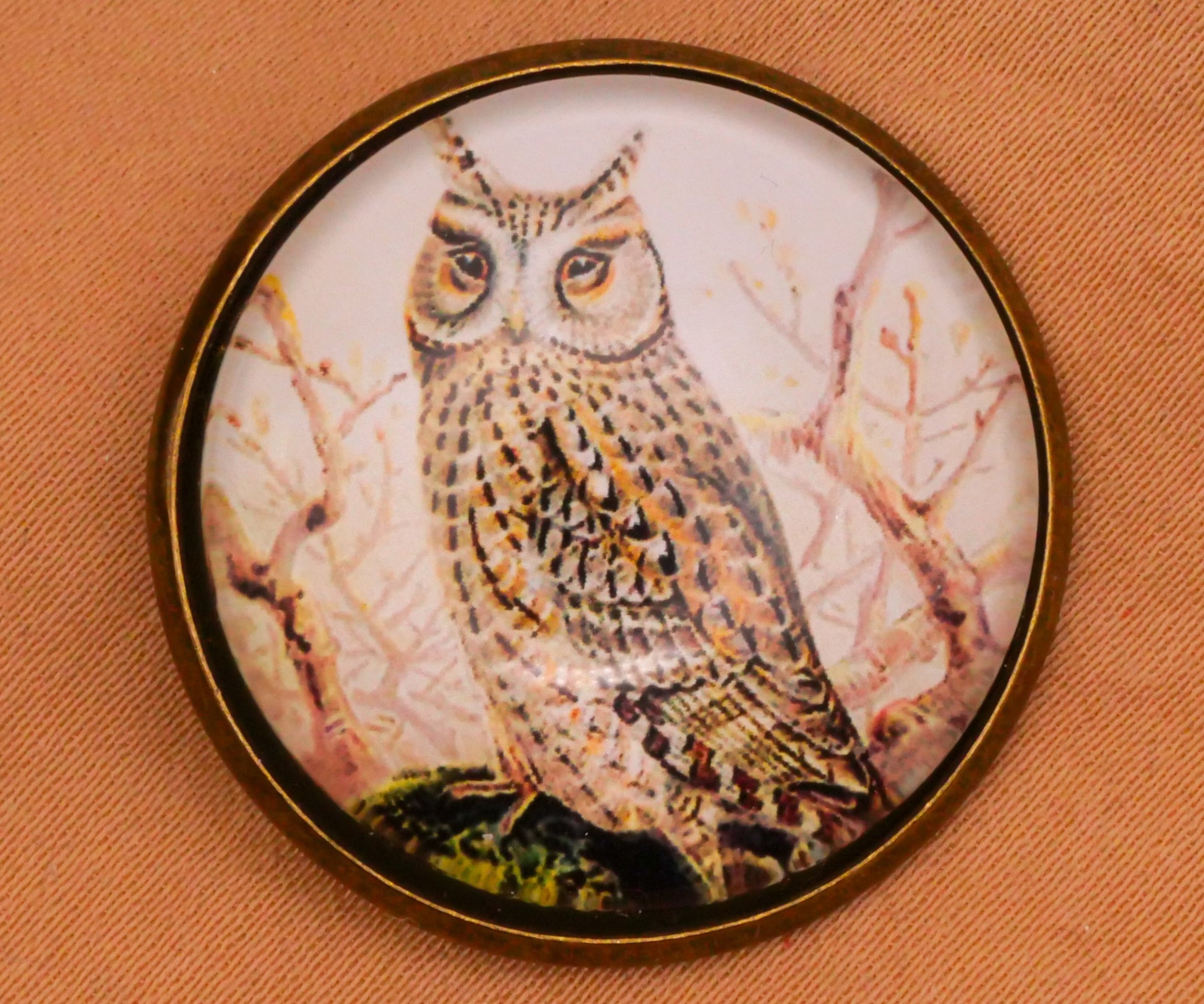 Handsome owl button with reproduction of vintage natural book illustration. Glass dome and bronze metal button measures 28mm / 1.1" in diameter.