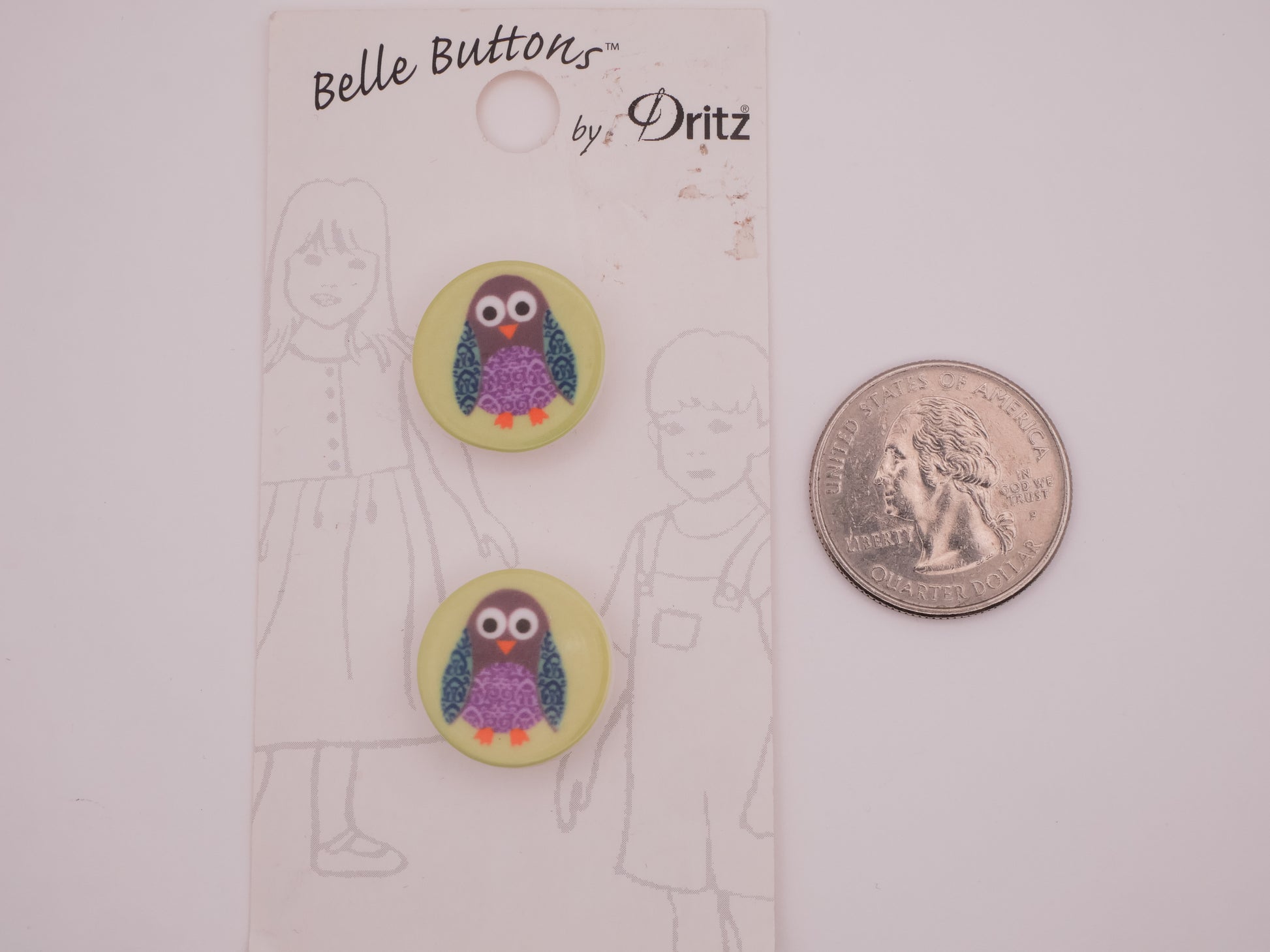 So cute! Pair of carded plastic owl buttons in green, purple, and teal. Each button measures 18mm / .71" in diameter.