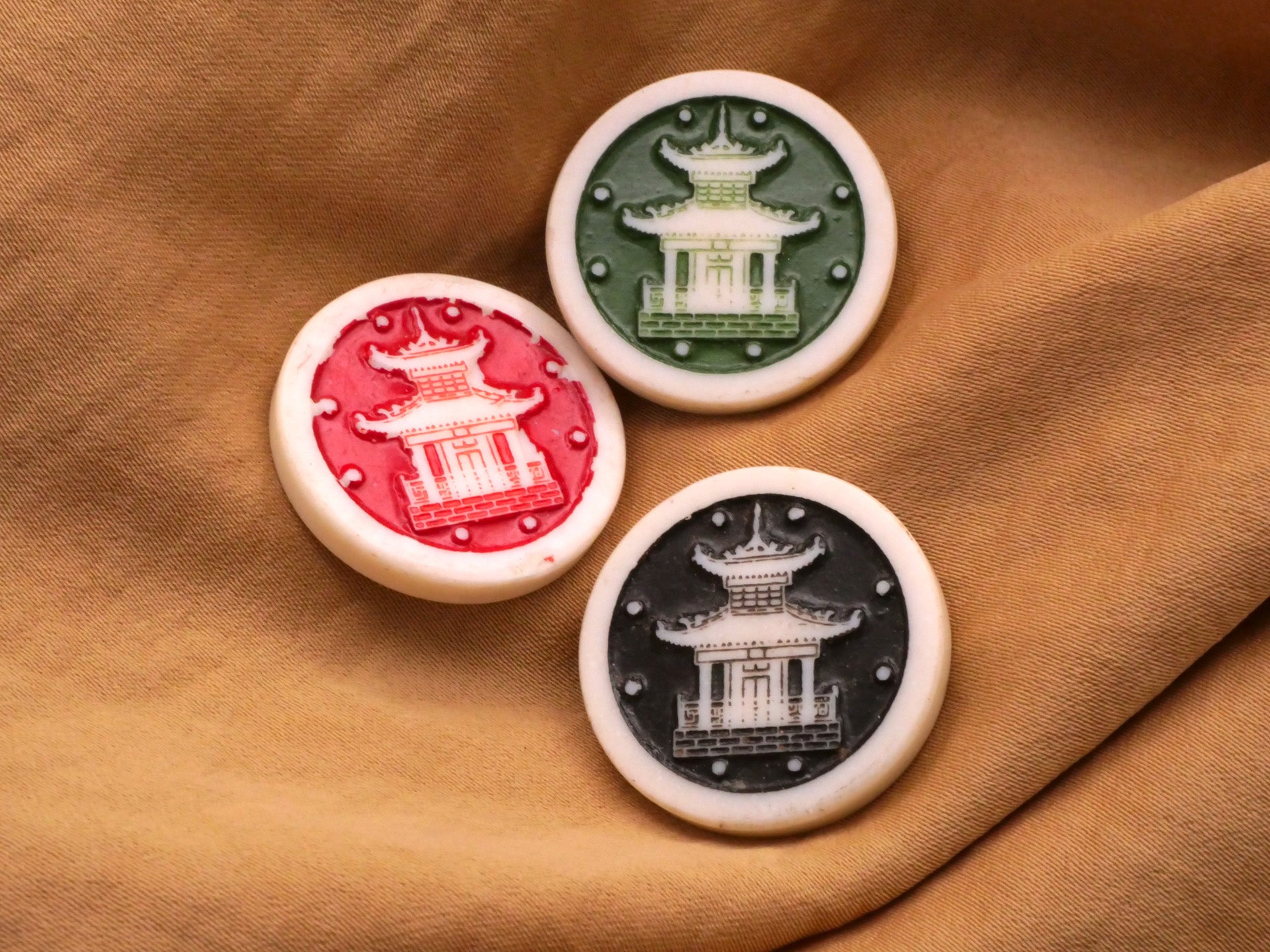 Three colors to choose from! These pagoda design Artid buttons are available in black, red, and green (one only!). Condition varies from button to button, but are generally in really good vintage 1940's condition. Each measures 25mm / .98" in diameter.