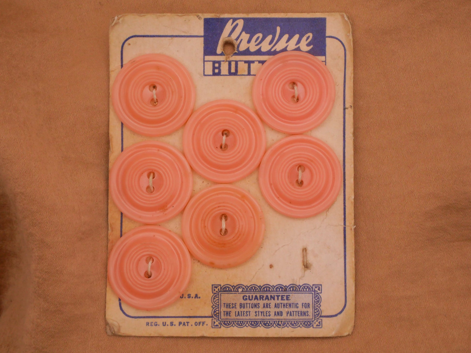 Seven peachy pink early plastic buttons on their original card! A couple have staining, but the whole set is still lovely! Each measures 22mm / .87" in diameter.