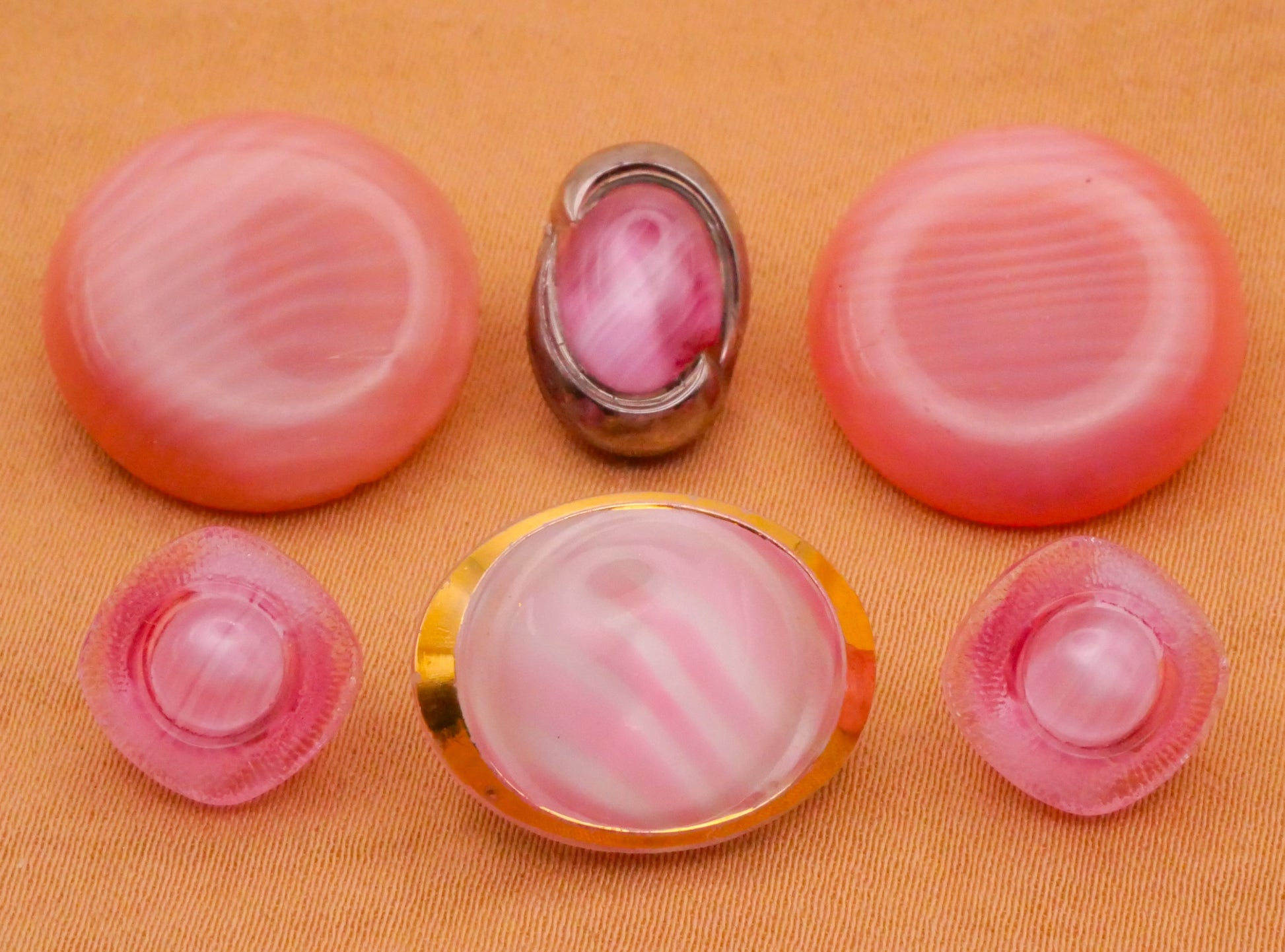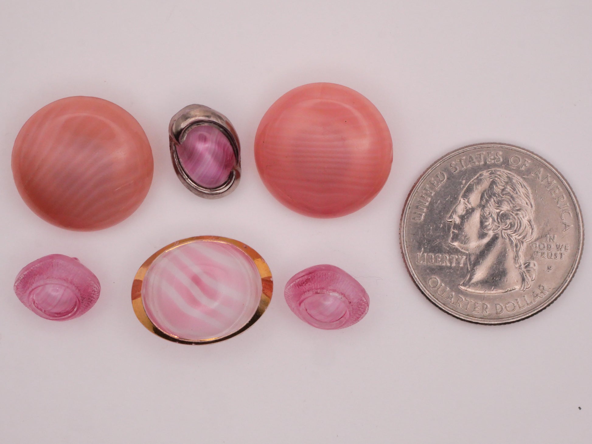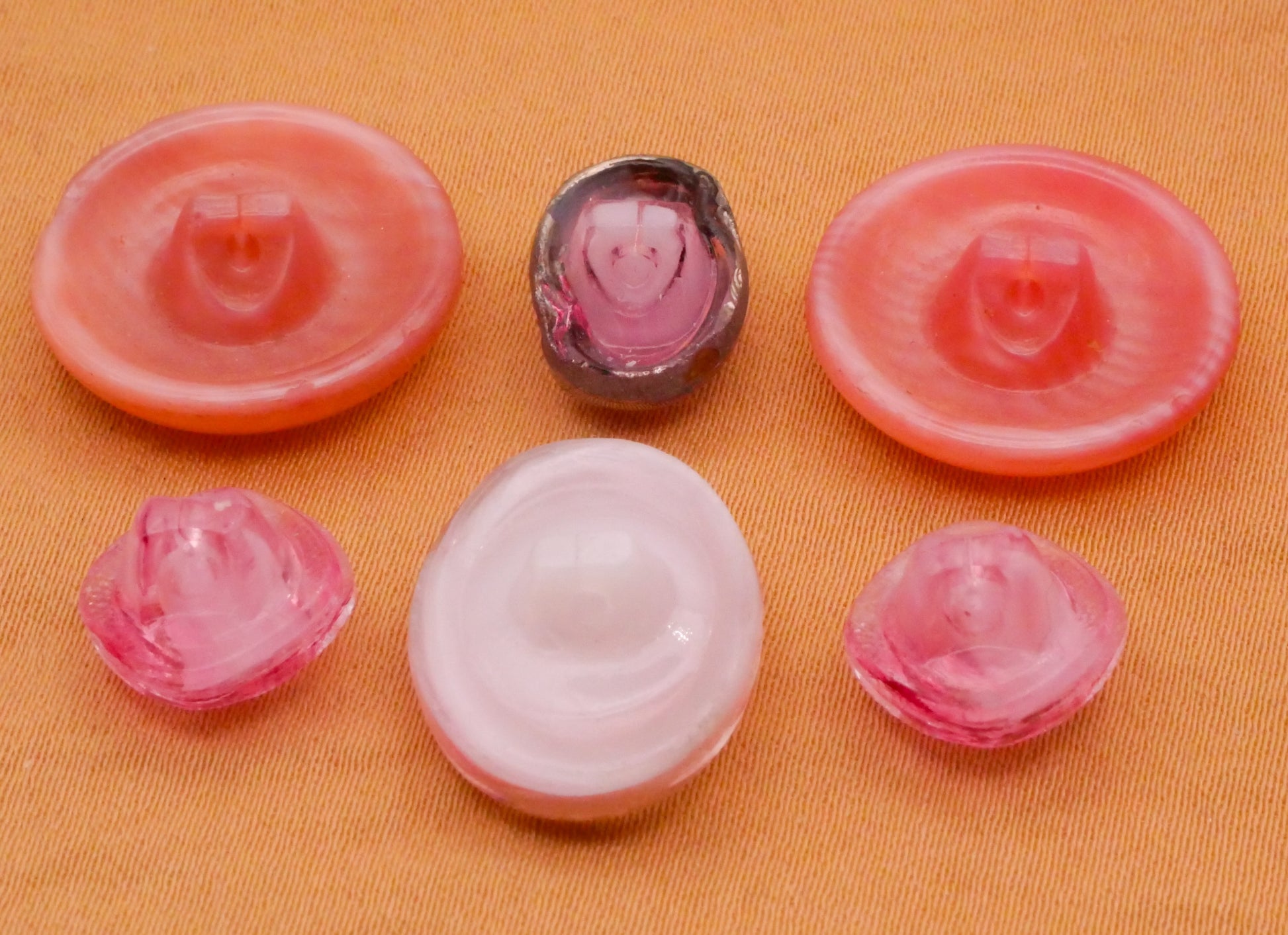 Lovely pink dig dug vintage glass buttons to choose from. These measure between 9-18mm / .35"-.71". Choose top or bottom and left, center, or right.