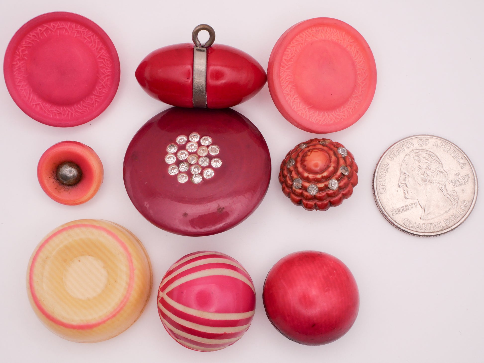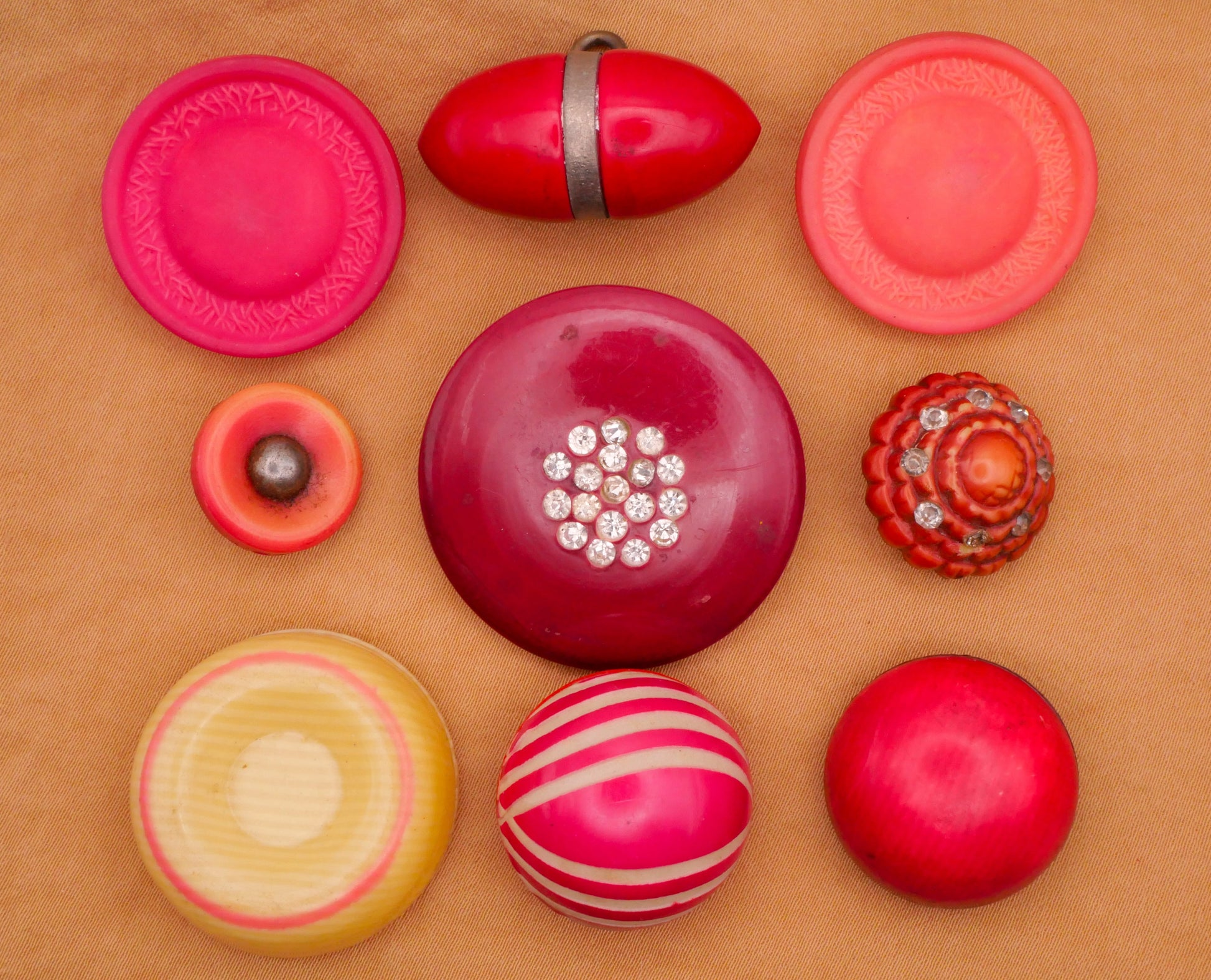 Fantastic pink celluloid early plastic buttons, choose your favorite! Most are a vibrant hot pink, but bottom left is a striped ivory bubble with pink stripe. All are very cool! These measure between 15-34mm / .59"-1.34". Choose top, middle, or bottom and left, center, or right.