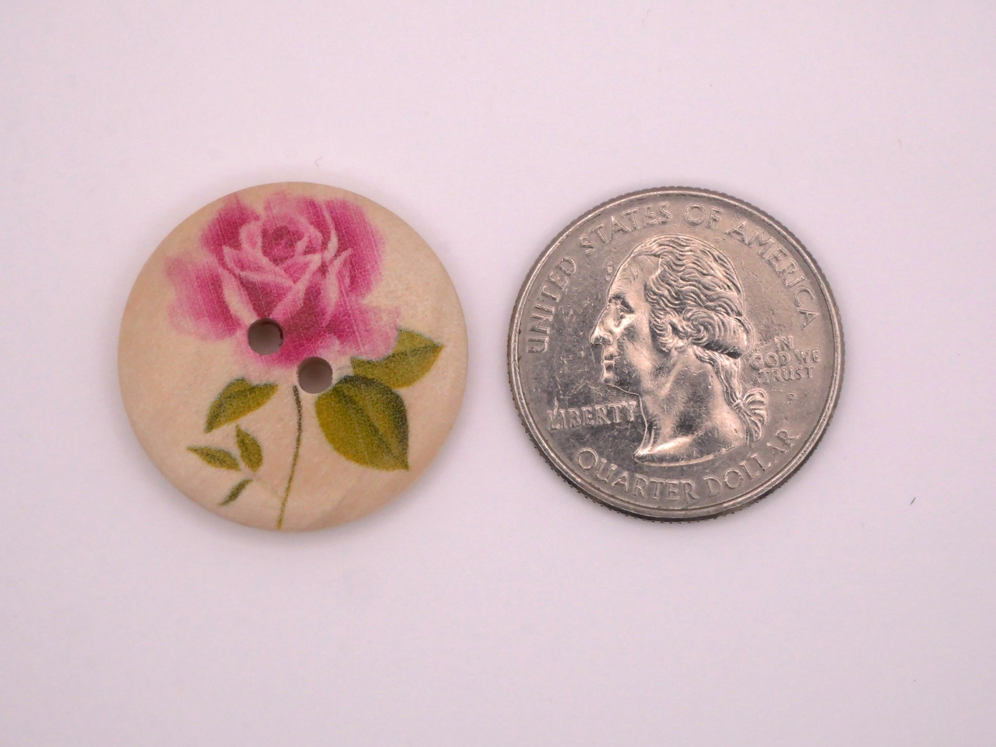 Pretty! Each of these wood buttons features a pink rose in the center. Sold in pairs. Each measures 25mm / .98" in diameter.